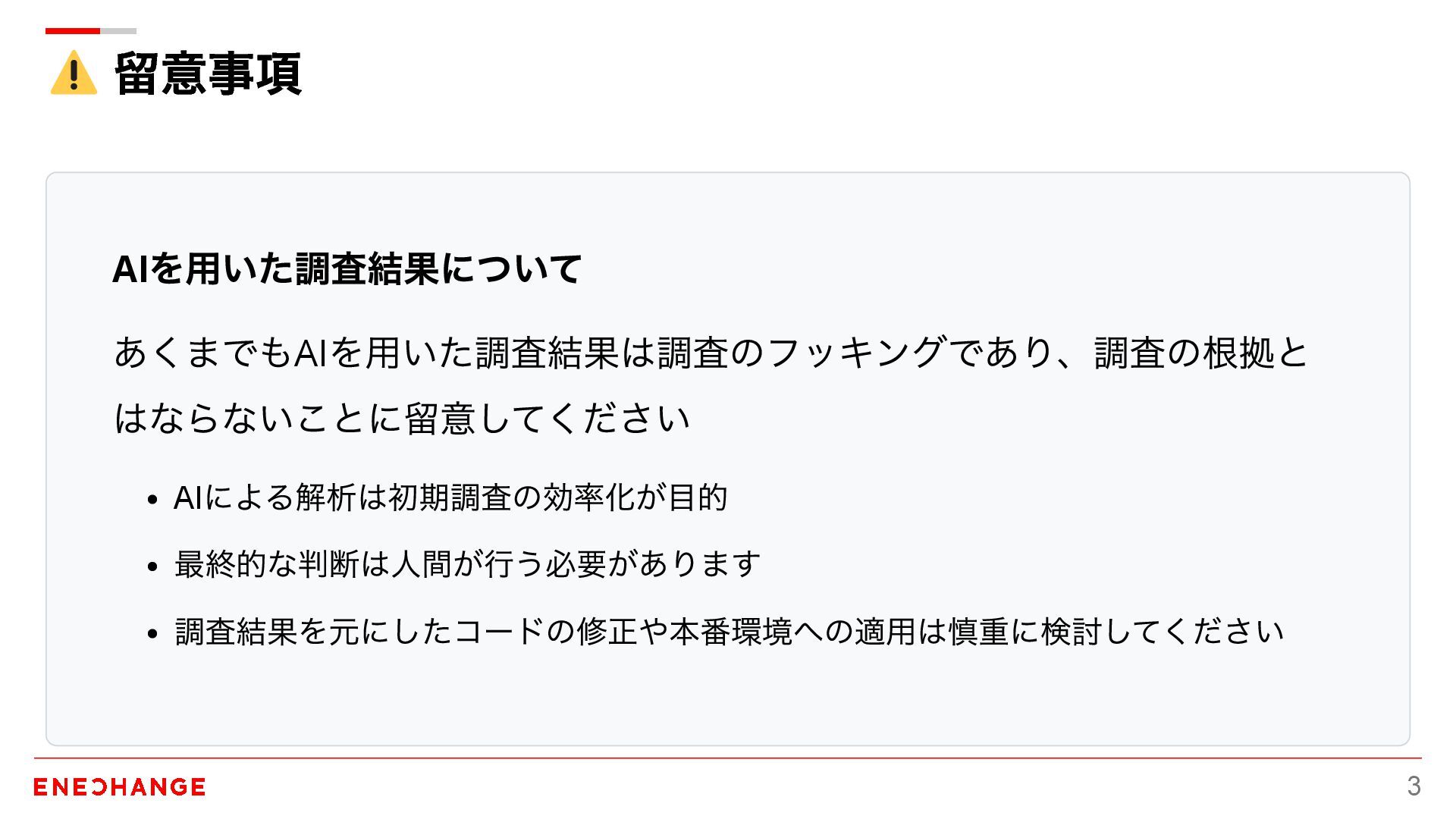 AI を用いた調査結果について あくまでもAI を用いた調査結果は調査のフッキングであり、調査の根拠と はならないことに留意してください AI による解析は初期調査の効率化が目的 最終的な判断は人間が行う必要があります 調査結果を元にしたコードの修正や本番環境への適用は慎重に検討してください 留意事項