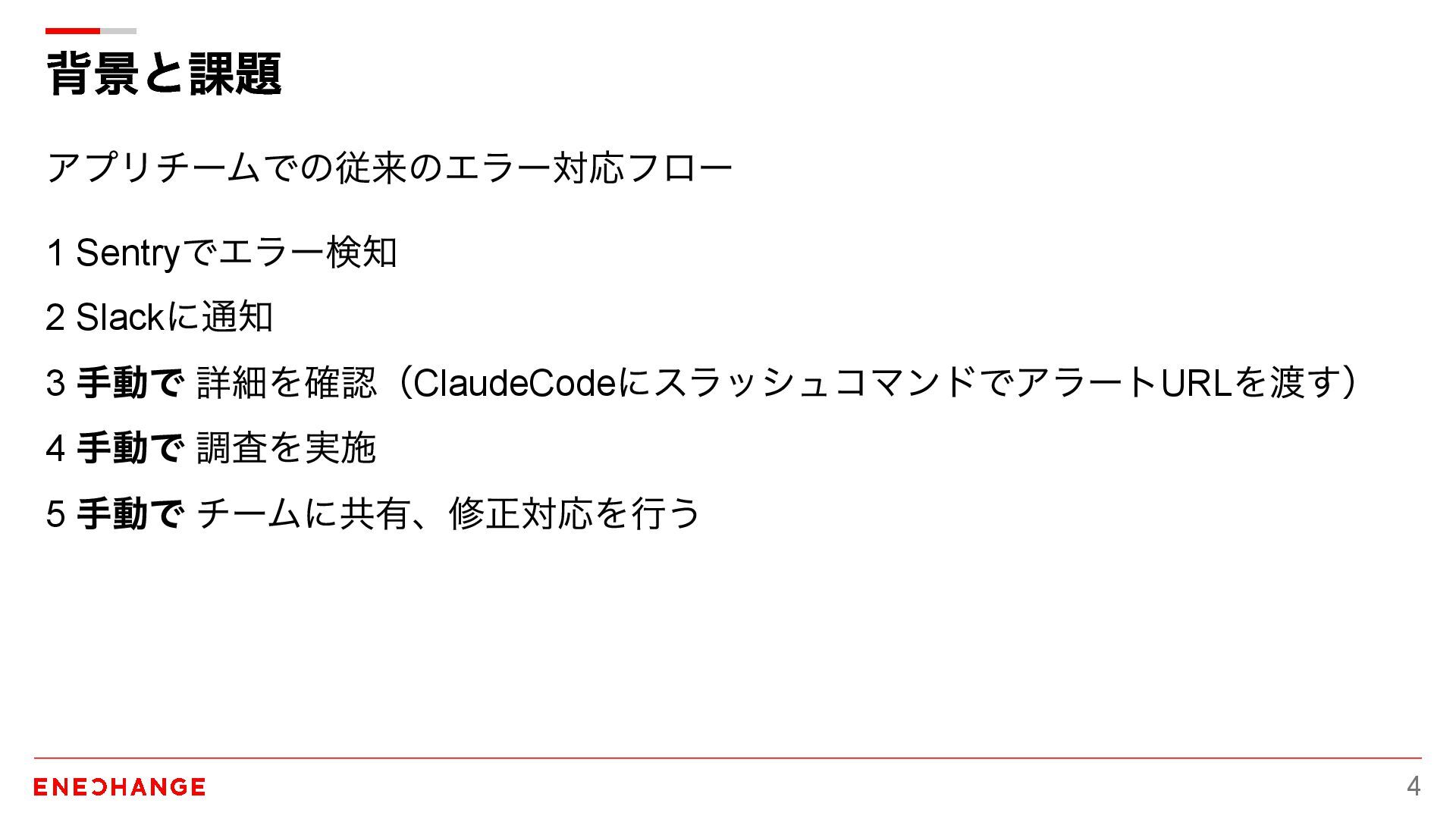 アプリチームでの従来のエラー対応フロー 1 Sentry でエラー検知 2 Slack に通知 3 手動で 詳細を確認(ClaudeCode