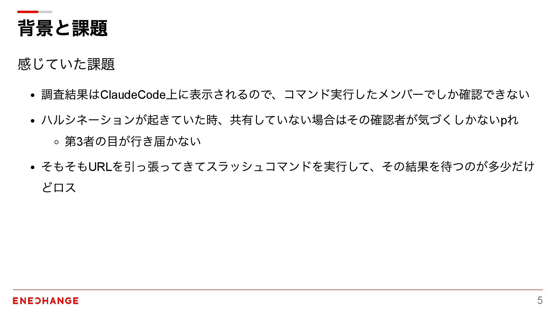 感じていた課題 調査結果はClaudeCode 上に表示されるので、コマンド実行したメンバーでしか確認できない ハルシネーションが起きていた時、共有していない場合はその確認者が気づくしかないp れ 第3 者の目が行き届かない そもそもURL を引っ張ってきてスラッシュコマンドを実行して、その結果を待つのが多少だけ どロス