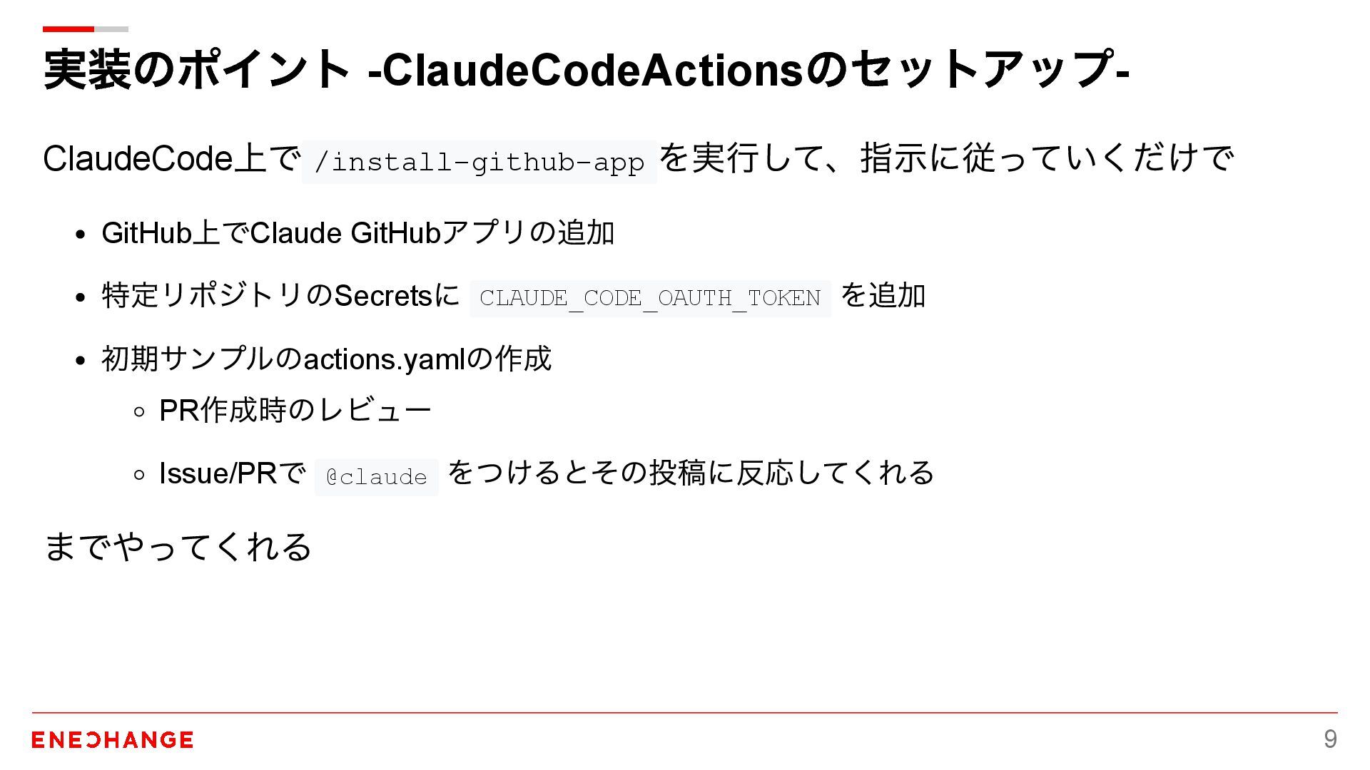 CLAUDE_CODE_OAUTH_TOKEN を追加 初期サンプルのactions.yaml の作成 PR 作成時のレビュー Issue/PR で @claude をつけるとその投稿に反応してくれる までやってくれる 実装のポイント -ClaudeCodeActions のセットアップ- 9