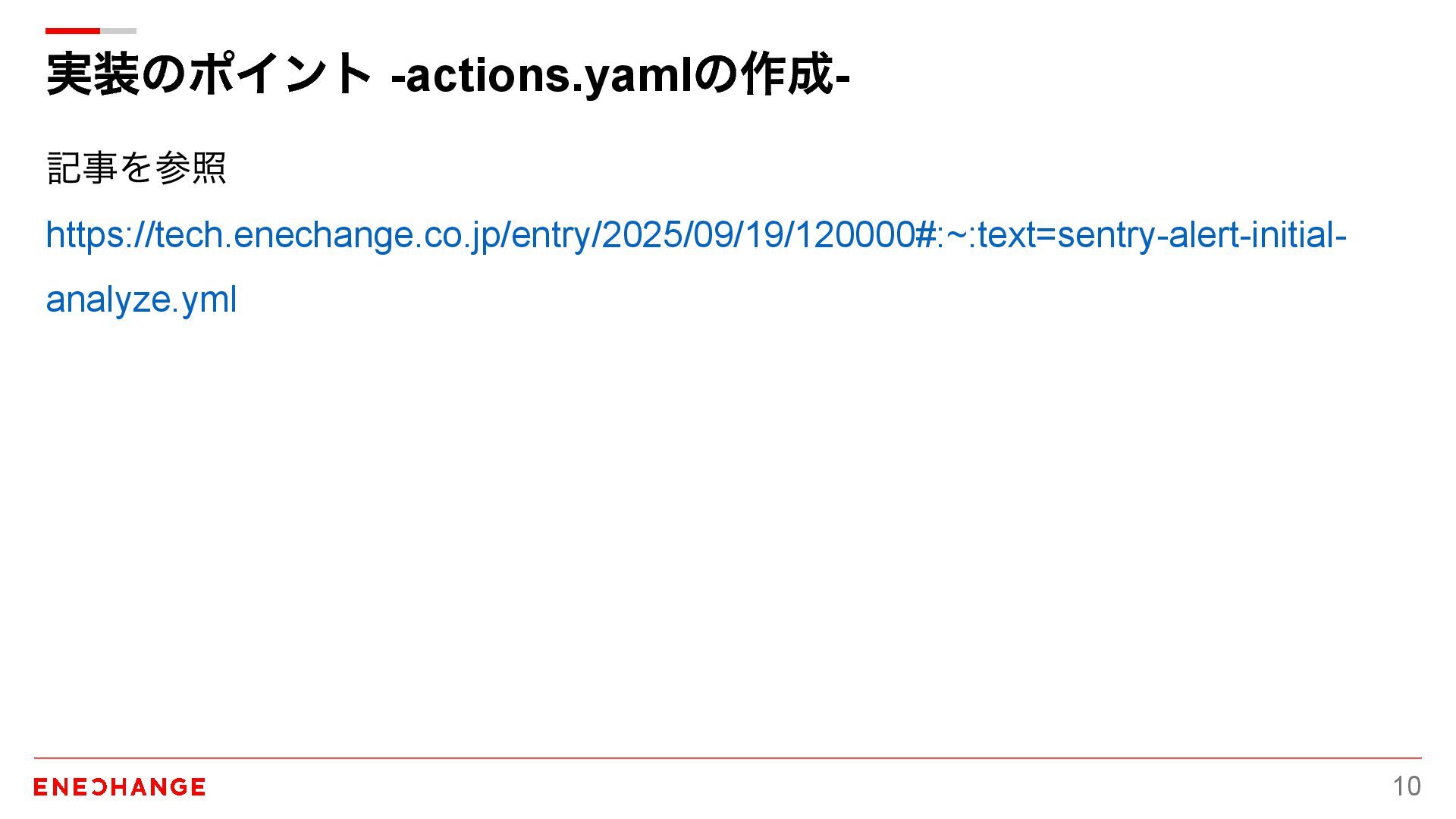 記事を参照 https://tech.enechange.co.jp/entry/2025/09/19/120000#:~:text=sentry-alert-initial- analyze.yml 実装のポイント -actions.yaml の作成- 10