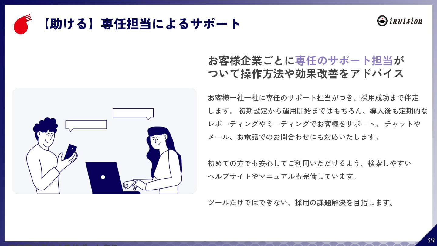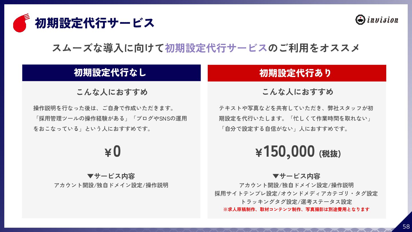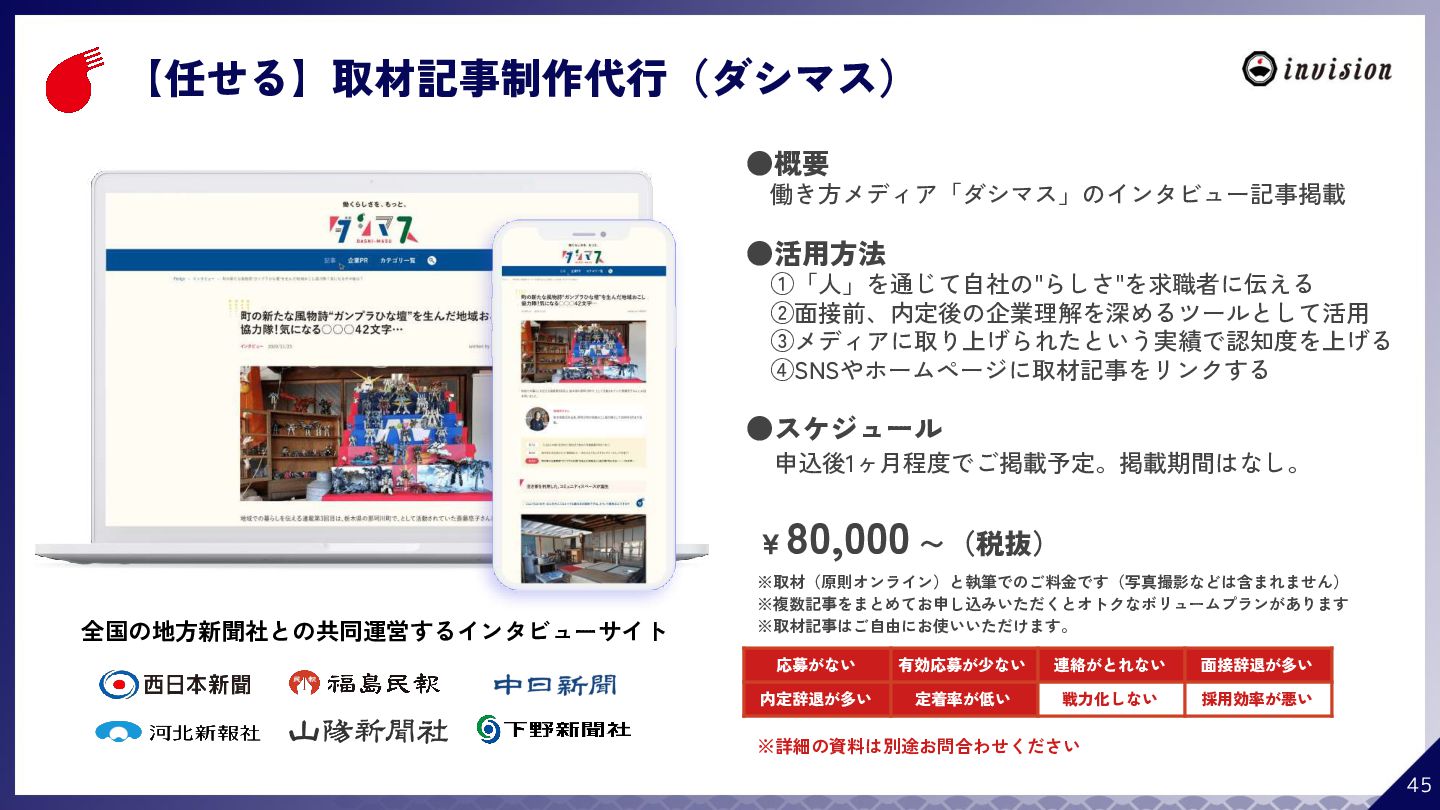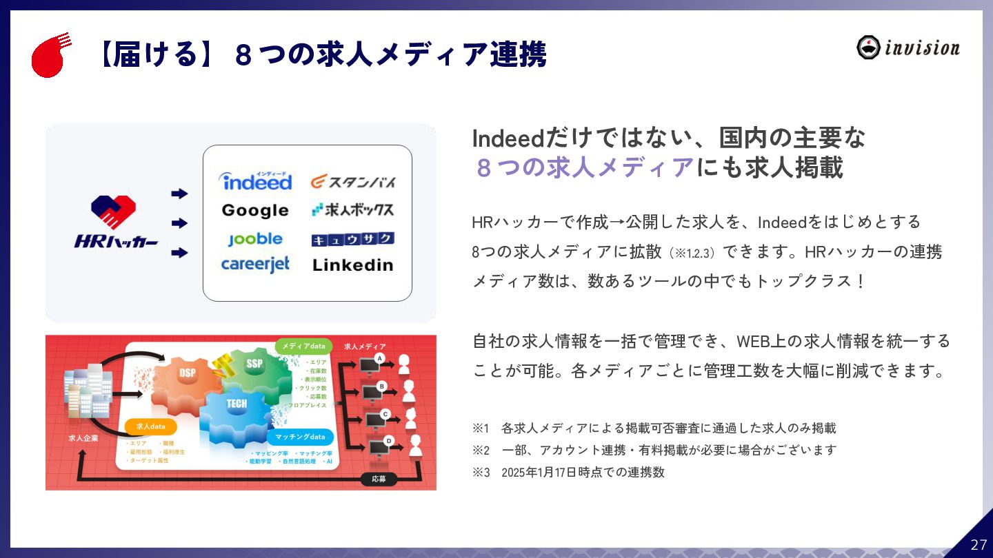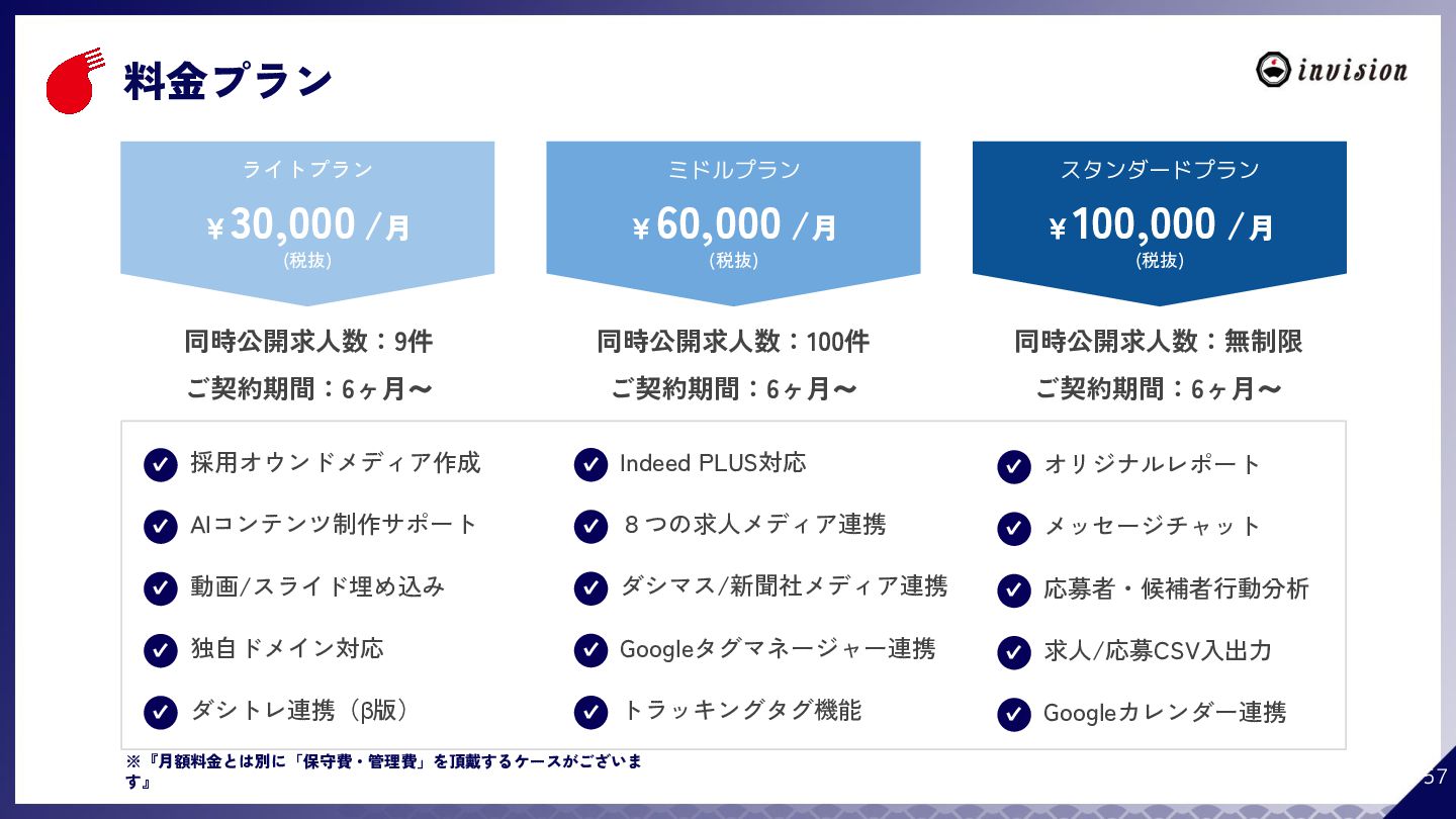 ¥60,000 /月 (税抜) スタンダードプラン ¥100,000 /月 (税抜) 採用オウンドメディア作成 ✔ AIコンテンツ制作サポート ✔ 動画/スライド埋め込み ✔ 独自ドメイン対応 ✔ ダシトレ連携(β版) ✔ 同時公開求人数:9件 ご契約期間:6ヶ月~ 同時公開求人数:100件 ご契約期間:6ヶ月~ 同時公開求人数:無制限 ご契約期間:6ヶ月~ Indeed PLUS対応 ✔ 8つの求人メディア連携 ✔ ダシマス/新聞社メディア連携 ✔ Googleタグマネージャー連携 ✔ トラッキングタグ機能 ✔ オリジナルレポート ✔ メッセージチャット ✔ 応募者・候補者行動分析 ✔ 求人/応募CSV入出力 ✔ Googleカレンダー連携 ✔ ※『月額料金とは別に「保守費・管理費」を頂戴するケースがございま す』