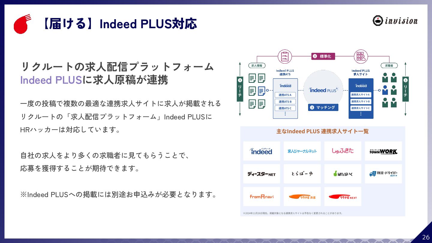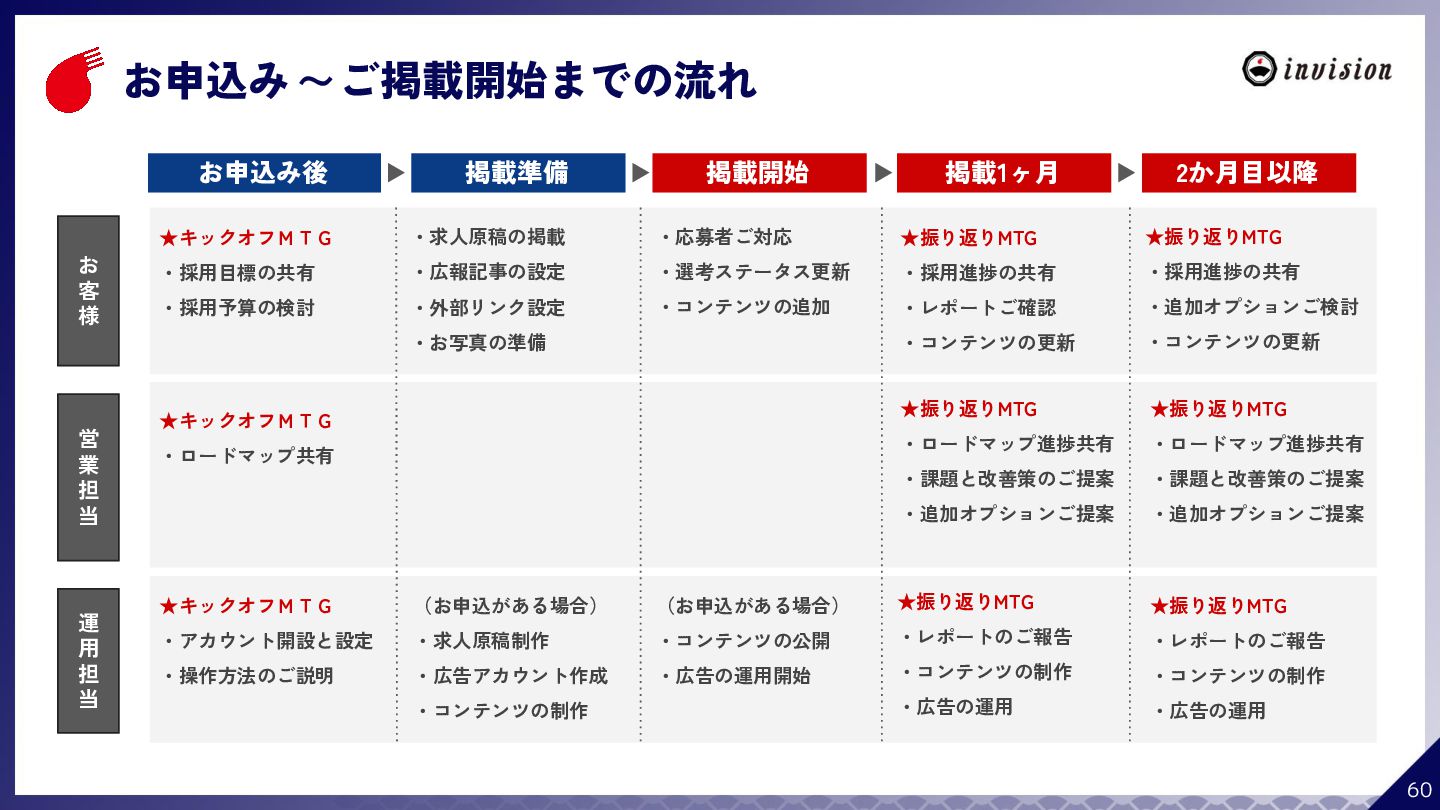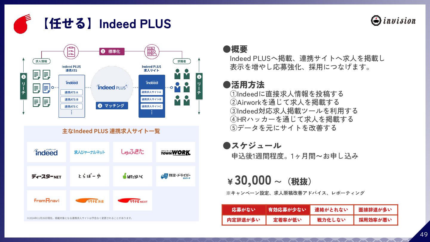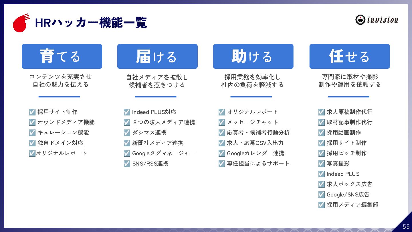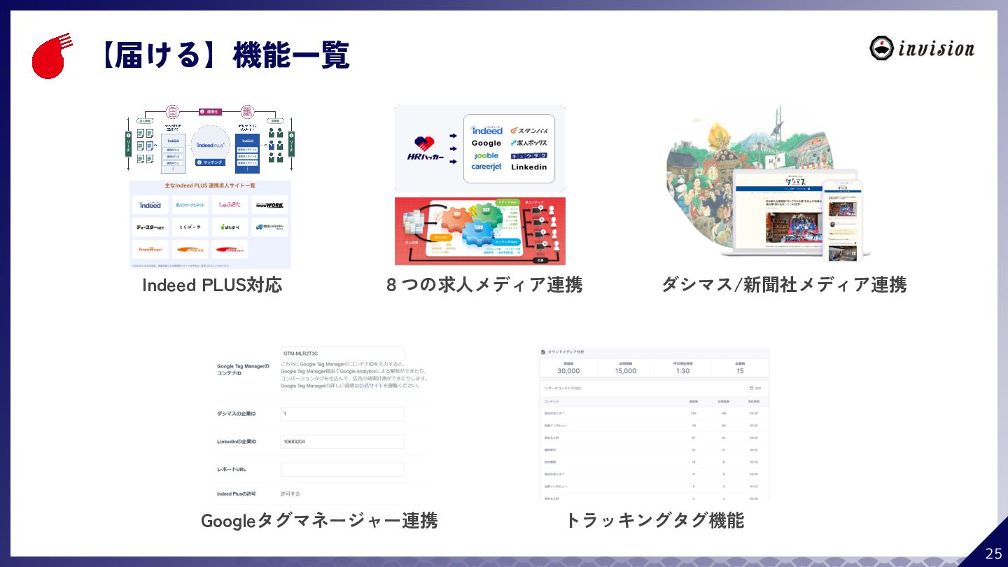 ¥60,000 /月 (税抜) スタンダードプラン ¥100,000 /月 (税抜) 採用オウンドメディア作成 ✔ AIコンテンツ制作サポート ✔ 動画/スライド埋め込み ✔ 独自ドメイン対応 ✔ ダシトレ連携(β版) ✔ 同時公開求人数:9件 ご契約期間:6ヶ月~ 同時公開求人数:100件 ご契約期間:6ヶ月~ 同時公開求人数:無制限 ご契約期間:6ヶ月~ Indeed PLUS対応 ✔ 8つの求人メディア連携 ✔ ダシマス/新聞社メディア連携 ✔ Googleタグマネージャー連携 ✔ トラッキングタグ機能 ✔ オリジナルレポート ✔ メッセージチャット ✔ 応募者・候補者行動分析 ✔ 求人/応募CSV入出力 ✔ Googleカレンダー連携 ✔ ※『月額料金とは別に「保守費・管理費」を頂戴するケースがございま す』