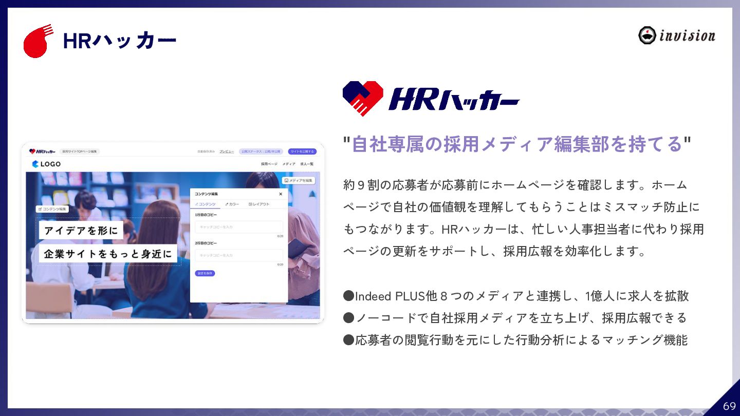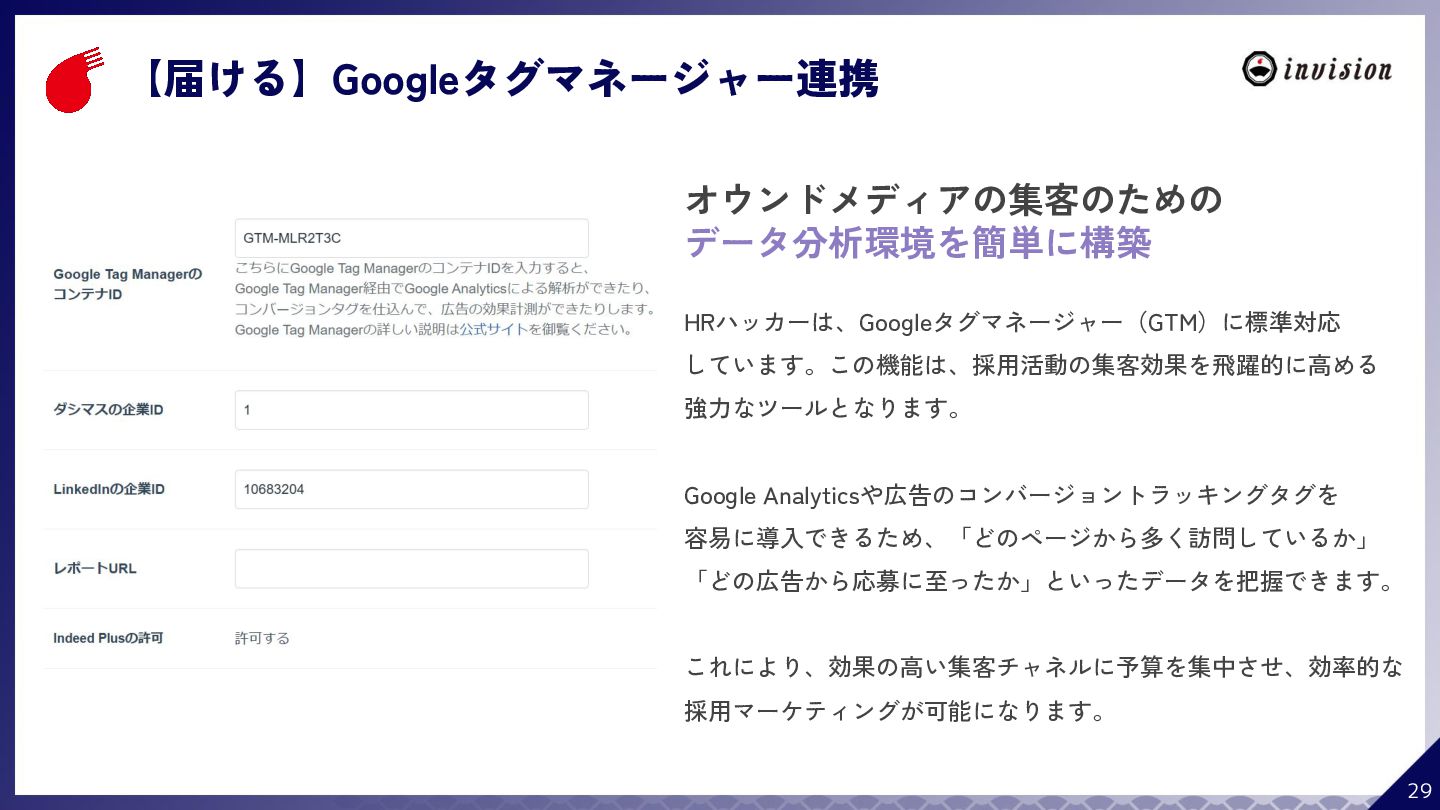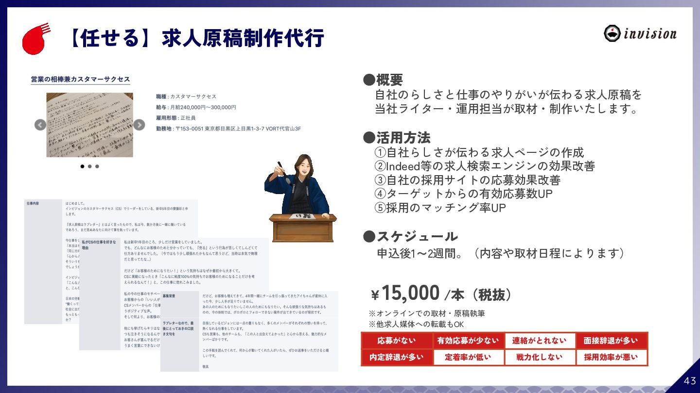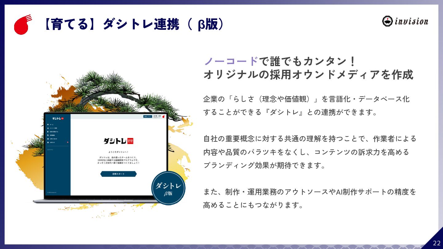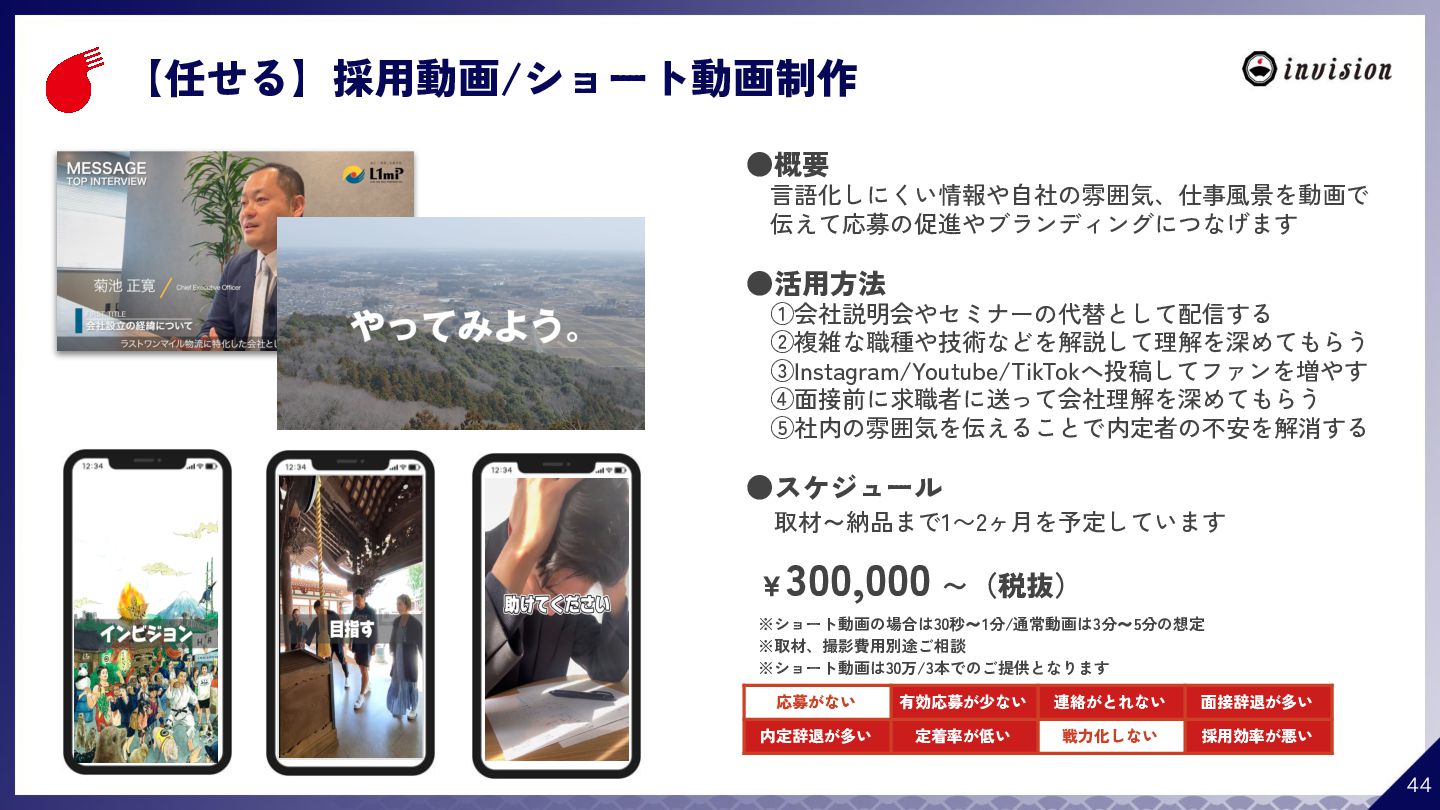 ¥60,000 /月 (税抜) スタンダードプラン ¥100,000 /月 (税抜) 採用オウンドメディア作成 ✔ AIコンテンツ制作サポート ✔ 動画/スライド埋め込み ✔ 独自ドメイン対応 ✔ ダシトレ連携(β版) ✔ 同時公開求人数:9件 ご契約期間:6ヶ月~ 同時公開求人数:100件 ご契約期間:6ヶ月~ 同時公開求人数:無制限 ご契約期間:6ヶ月~ Indeed PLUS対応 ✔ 8つの求人メディア連携 ✔ ダシマス/新聞社メディア連携 ✔ Googleタグマネージャー連携 ✔ トラッキングタグ機能 ✔ オリジナルレポート ✔ メッセージチャット ✔ 応募者・候補者行動分析 ✔ 求人/応募CSV入出力 ✔ Googleカレンダー連携 ✔ ※『月額料金とは別に「保守費・管理費」を頂戴するケースがございま す』