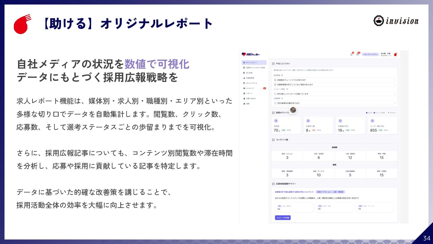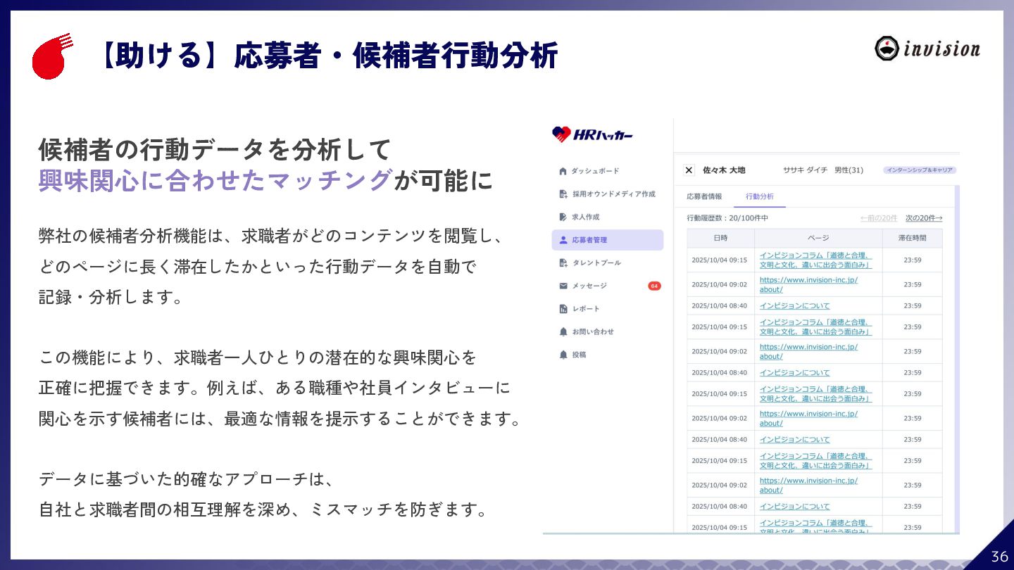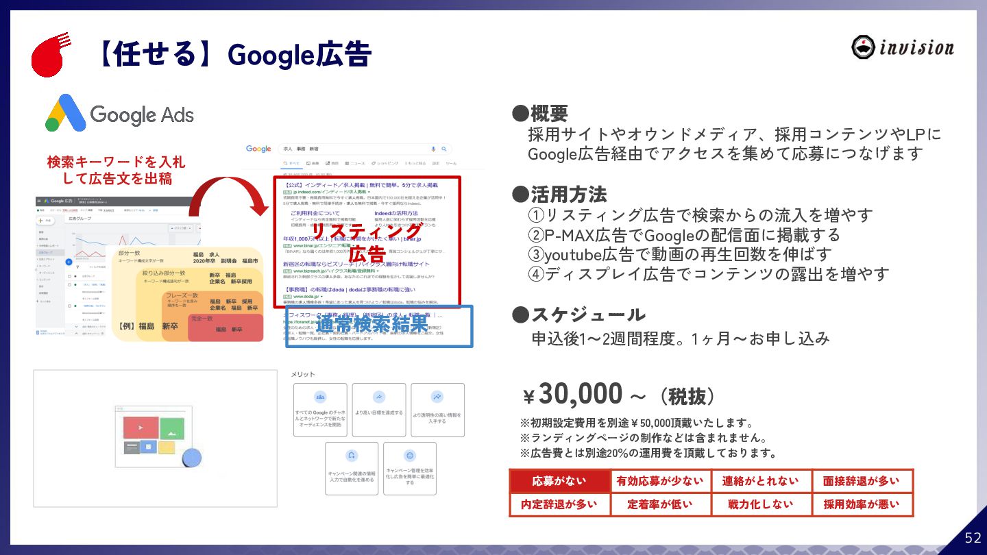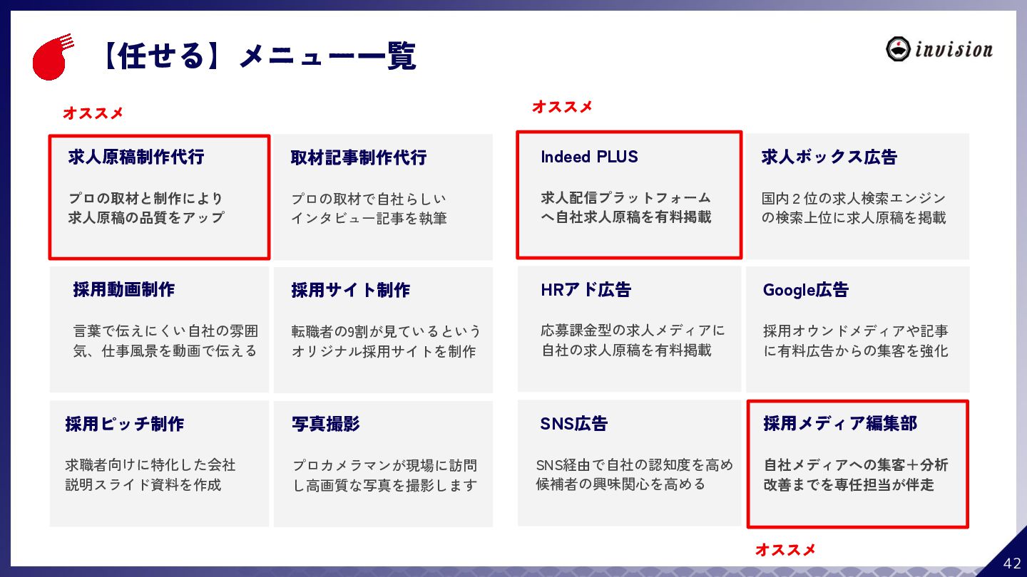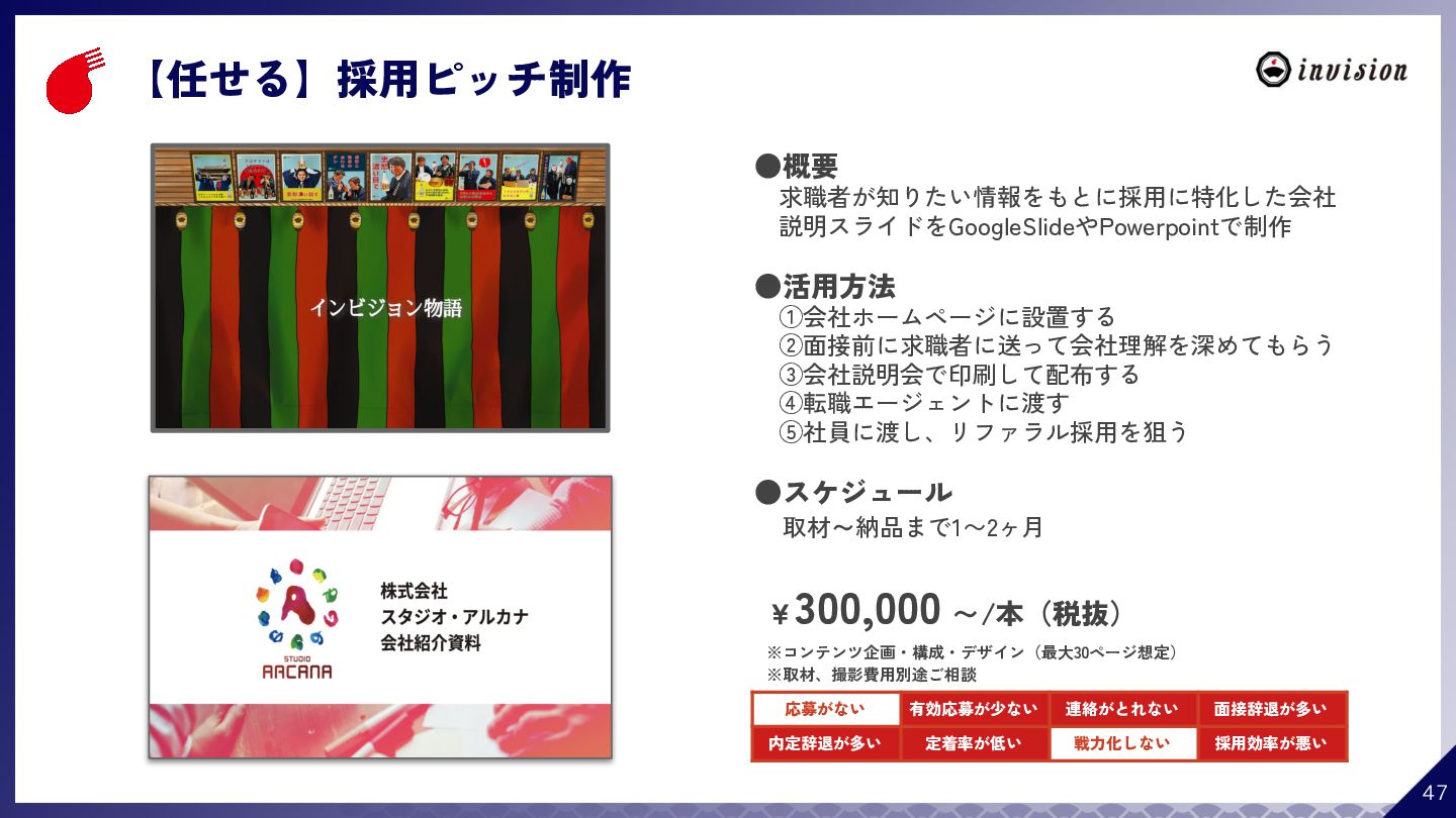 ¥60,000 /月 (税抜) スタンダードプラン ¥100,000 /月 (税抜) 採用オウンドメディア作成 ✔ AIコンテンツ制作サポート ✔ 動画/スライド埋め込み ✔ 独自ドメイン対応 ✔ ダシトレ連携(β版) ✔ 同時公開求人数:9件 ご契約期間:6ヶ月~ 同時公開求人数:100件 ご契約期間:6ヶ月~ 同時公開求人数:無制限 ご契約期間:6ヶ月~ Indeed PLUS対応 ✔ 8つの求人メディア連携 ✔ ダシマス/新聞社メディア連携 ✔ Googleタグマネージャー連携 ✔ トラッキングタグ機能 ✔ オリジナルレポート ✔ メッセージチャット ✔ 応募者・候補者行動分析 ✔ 求人/応募CSV入出力 ✔ Googleカレンダー連携 ✔ ※『月額料金とは別に「保守費・管理費」を頂戴するケースがございま す』