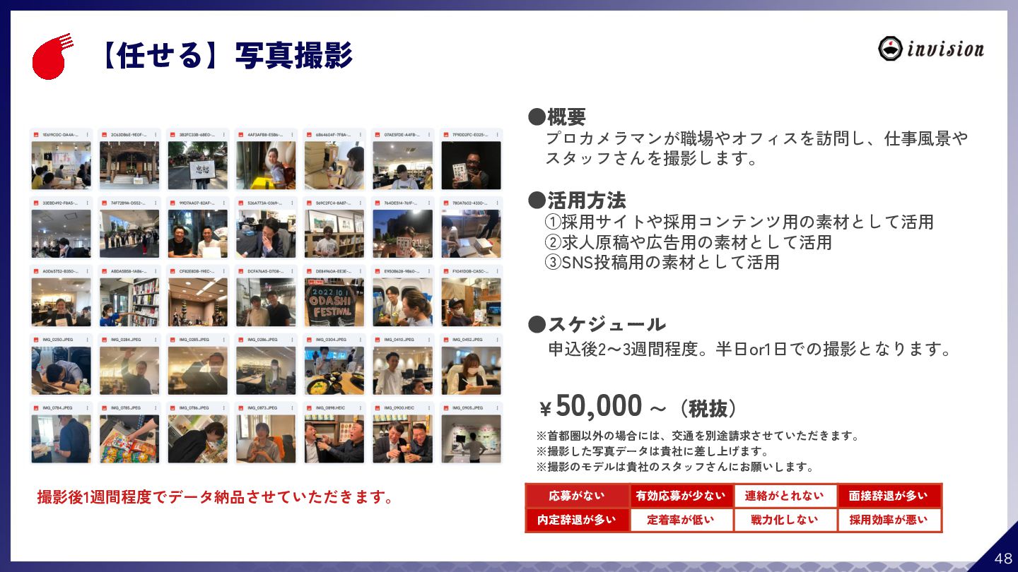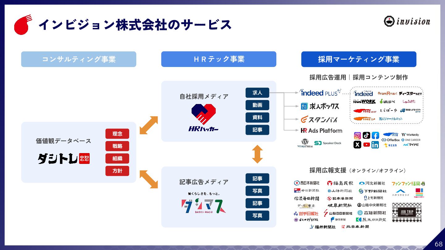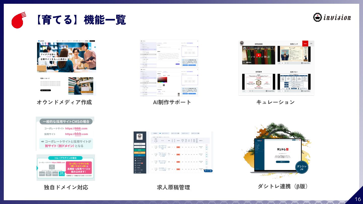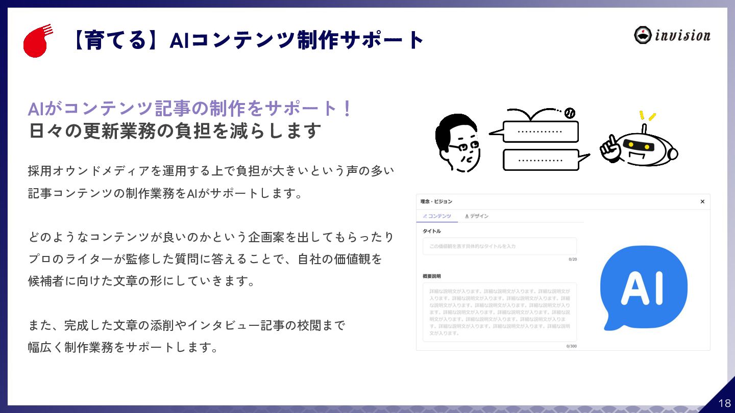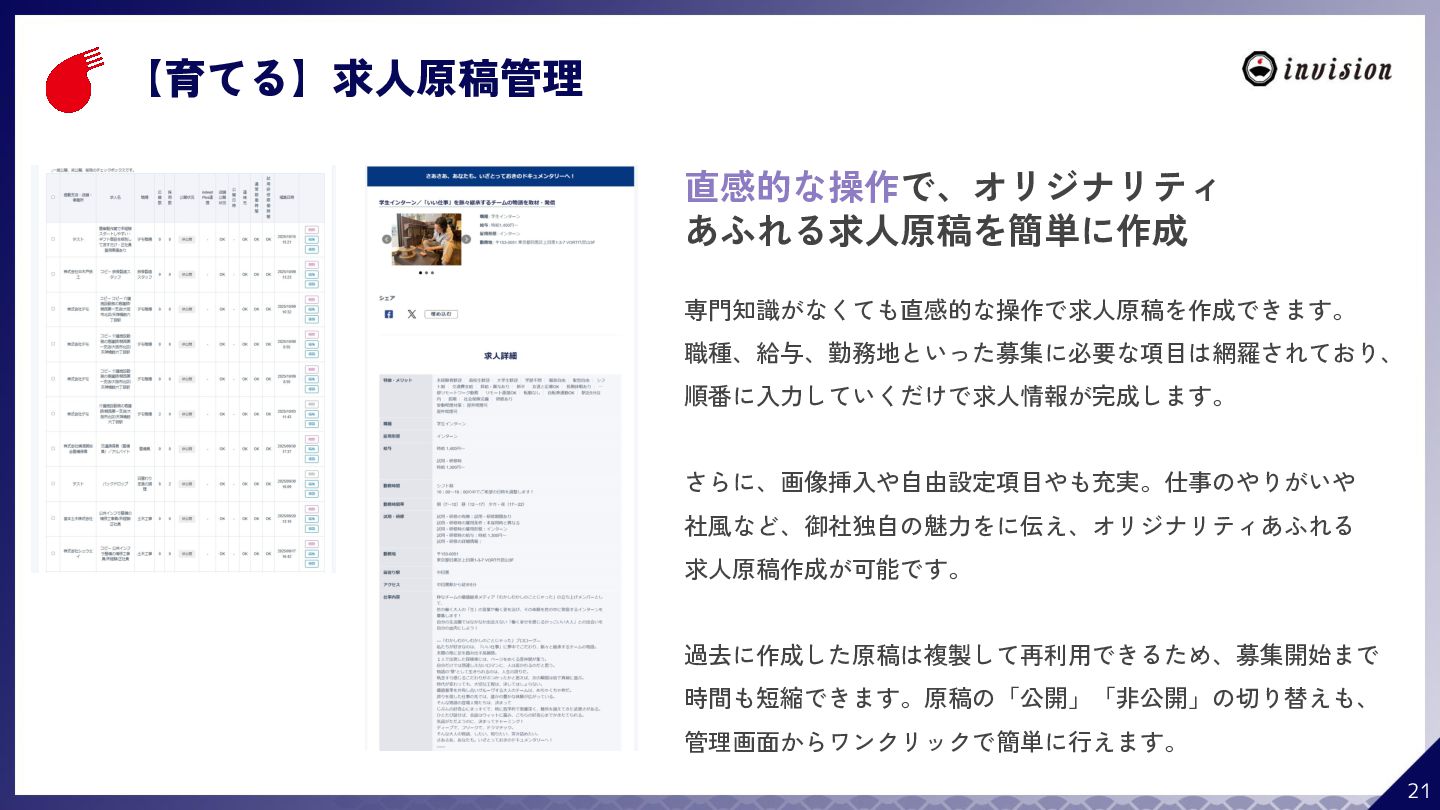 ¥60,000 /月 (税抜) スタンダードプラン ¥100,000 /月 (税抜) 採用オウンドメディア作成 ✔ AIコンテンツ制作サポート ✔ 動画/スライド埋め込み ✔ 独自ドメイン対応 ✔ ダシトレ連携(β版) ✔ 同時公開求人数:9件 ご契約期間:6ヶ月~ 同時公開求人数:100件 ご契約期間:6ヶ月~ 同時公開求人数:無制限 ご契約期間:6ヶ月~ Indeed PLUS対応 ✔ 8つの求人メディア連携 ✔ ダシマス/新聞社メディア連携 ✔ Googleタグマネージャー連携 ✔ トラッキングタグ機能 ✔ オリジナルレポート ✔ メッセージチャット ✔ 応募者・候補者行動分析 ✔ 求人/応募CSV入出力 ✔ Googleカレンダー連携 ✔ ※『月額料金とは別に「保守費・管理費」を頂戴するケースがございま す』