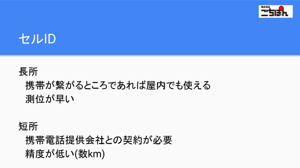 セルID 長所 携帯が繋がるところであれば屋内でも使える 測位が早い 短所 携帯電話提供会社との契約が必要 精度が低い(数km)