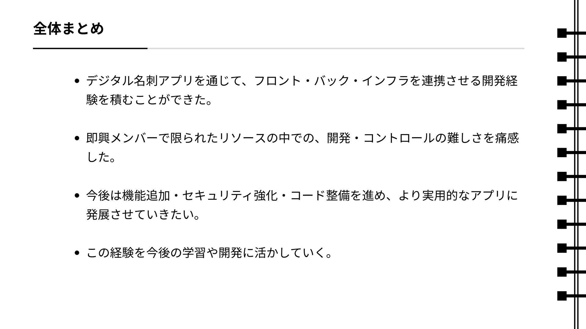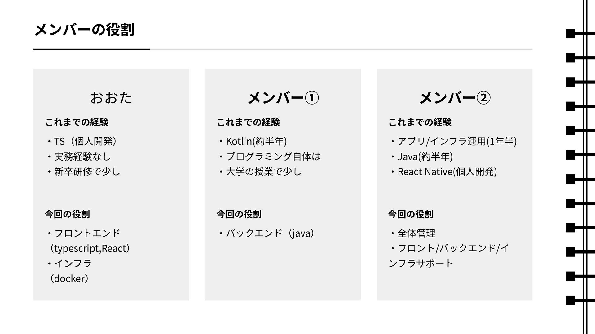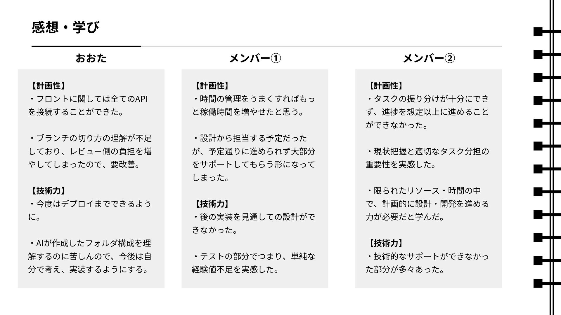 力が必要だと学んだ。 【技術力】 ・技術的なサポートができなかっ た部分が多々あった。 おおた 【計画性】 ・フロントに関しては全てのAPI を接続することができた。 ・ブランチの切り方の理解が不足 しており、レビュー側の負担を増 やしてしまったので、要改善。 【技術力】 ・今度はデプロイまでできるよう に。 ・AIが作成したフォルダ構成を理 解するのに苦しんので、今後は自 分で考え、実装するようにする。 メンバー① 【計画性】 ・時間の管理をうまくすればもっ と稼働時間を増やせたと思う。 ・設計から担当する予定だった が、予定通りに進められず大部分 をサポートしてもらう形になって しまった。 【技術力】 ・後の実装を見通しての設計がで きなかった。 ・テストの部分でつまり、単純な 経験値不足を実感した。