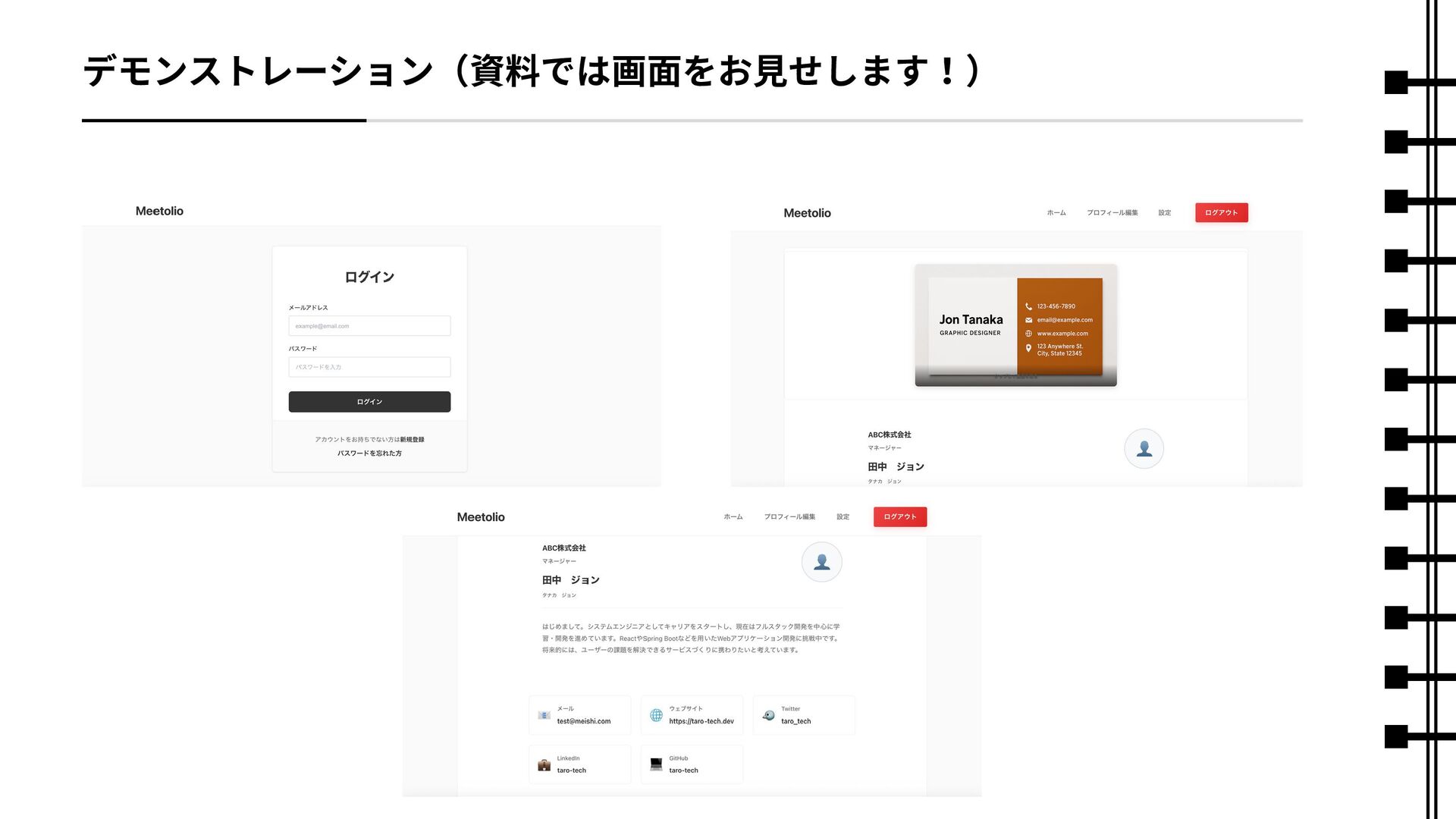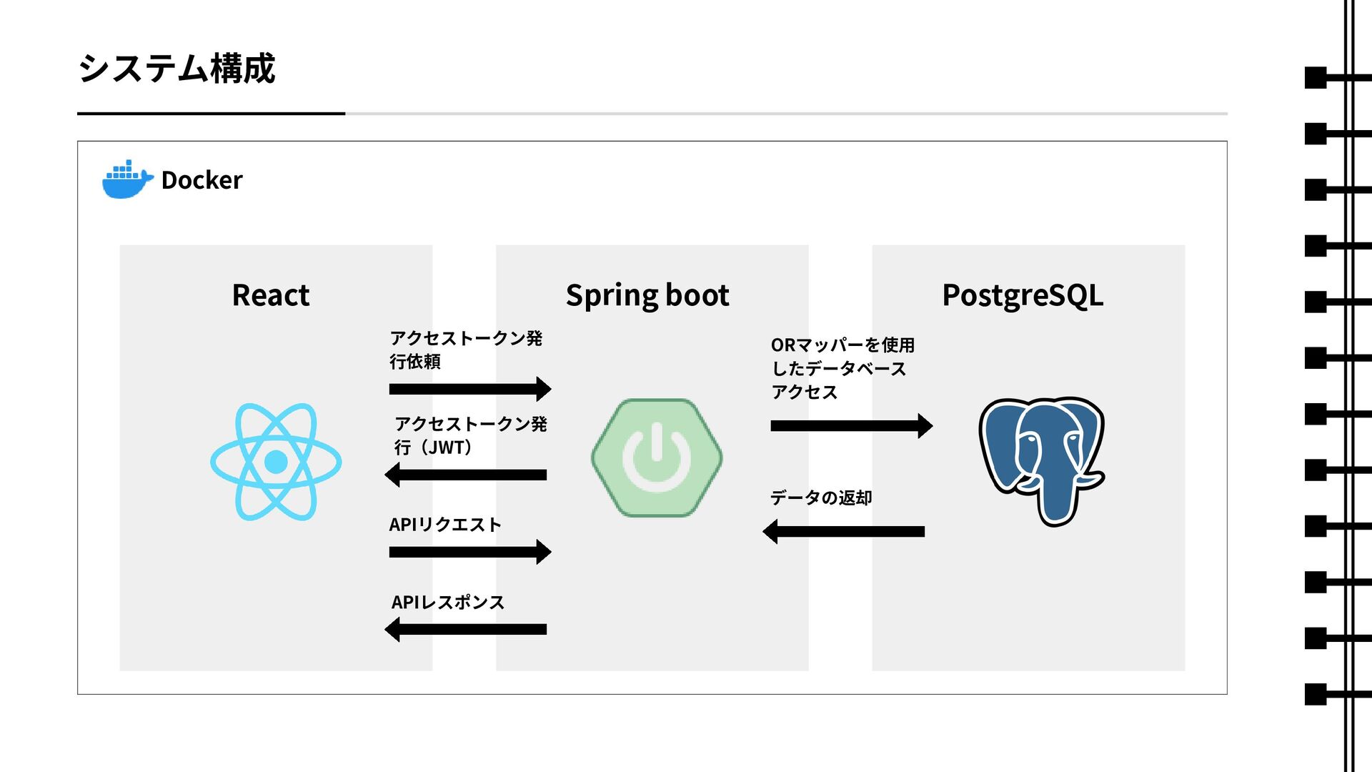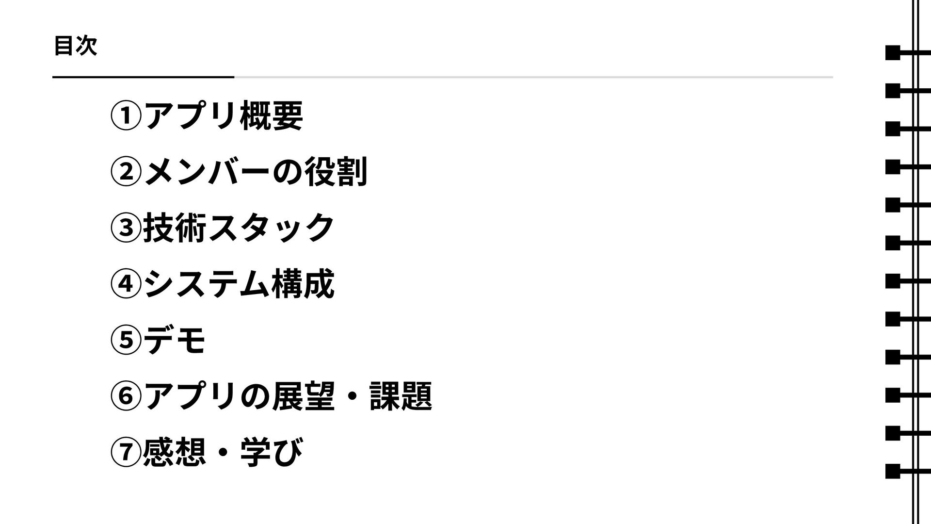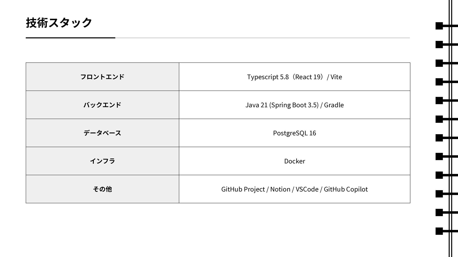 力が必要だと学んだ。 【技術力】 ・技術的なサポートができなかっ た部分が多々あった。 おおた 【計画性】 ・フロントに関しては全てのAPI を接続することができた。 ・ブランチの切り方の理解が不足 しており、レビュー側の負担を増 やしてしまったので、要改善。 【技術力】 ・今度はデプロイまでできるよう に。 ・AIが作成したフォルダ構成を理 解するのに苦しんので、今後は自 分で考え、実装するようにする。 メンバー① 【計画性】 ・時間の管理をうまくすればもっ と稼働時間を増やせたと思う。 ・設計から担当する予定だった が、予定通りに進められず大部分 をサポートしてもらう形になって しまった。 【技術力】 ・後の実装を見通しての設計がで きなかった。 ・テストの部分でつまり、単純な 経験値不足を実感した。