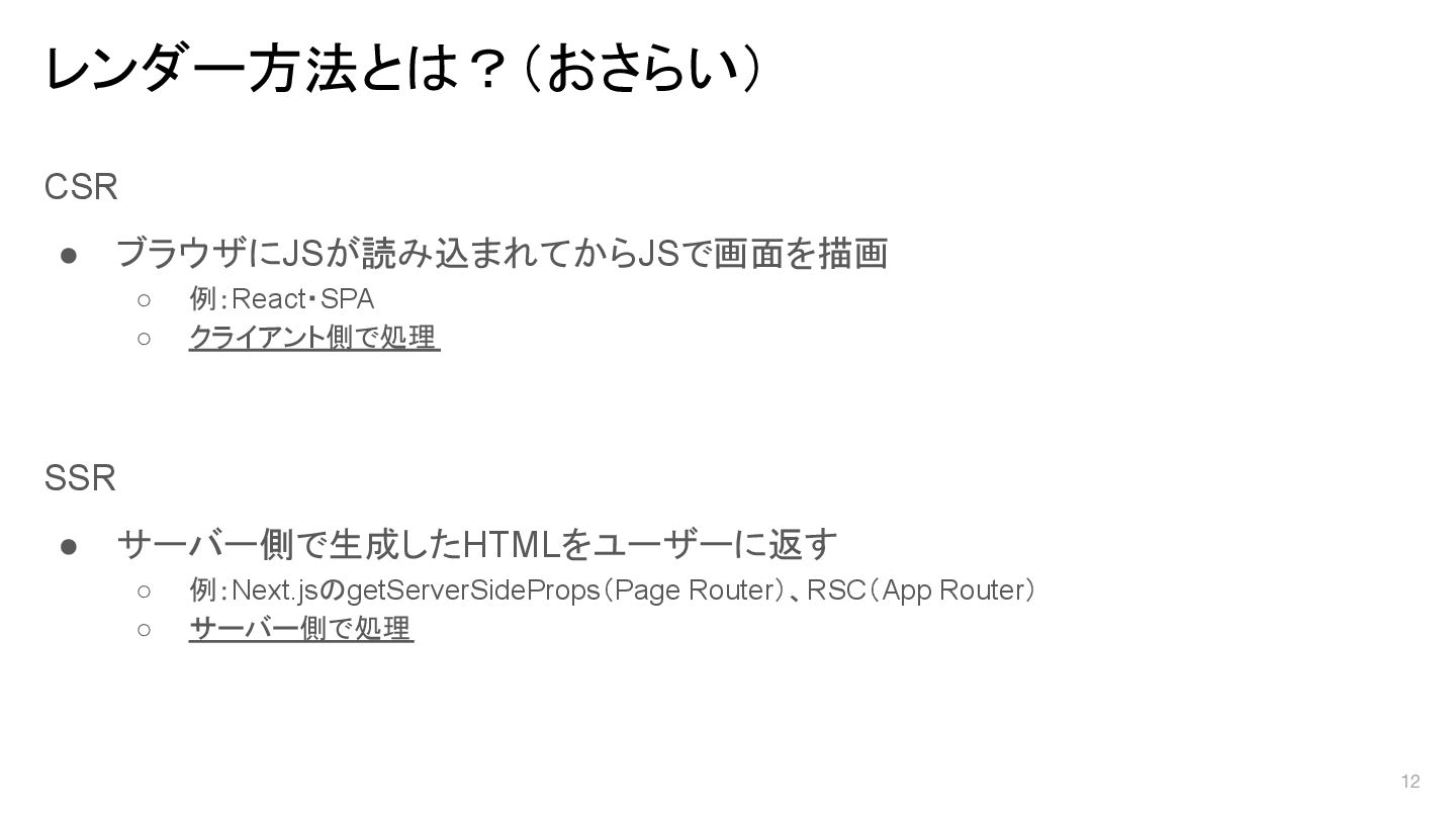 12 CSR • ブラウザにJSが読み込まれてからJSで画面を描画 ◦ 例:React・SPA ◦ クライアント側で処理 レンダー方法とは?(おさらい) SSR