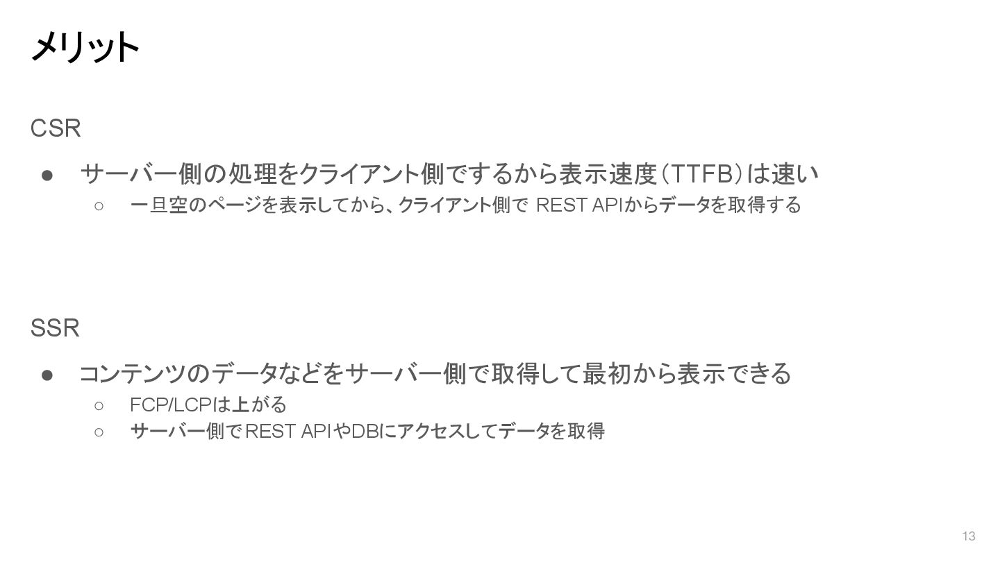 • コンテンツのデータなどをサーバー側で取得して最初から表示できる ◦ FCP/LCPは上がる ◦ サーバー側でREST APIやDBにアクセスしてデータを取得