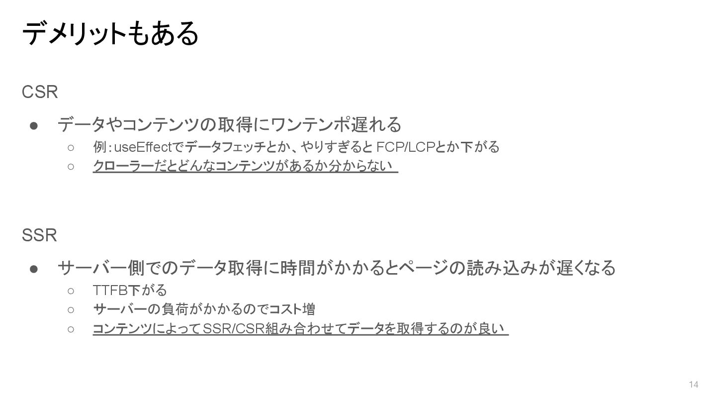 13 CSR • サーバー側の処理をクライアント側でするから表示速度(TTFB)は速い ◦ 一旦空のページを表示してから、クライアント側で REST APIからデータを取得する メリット SSR