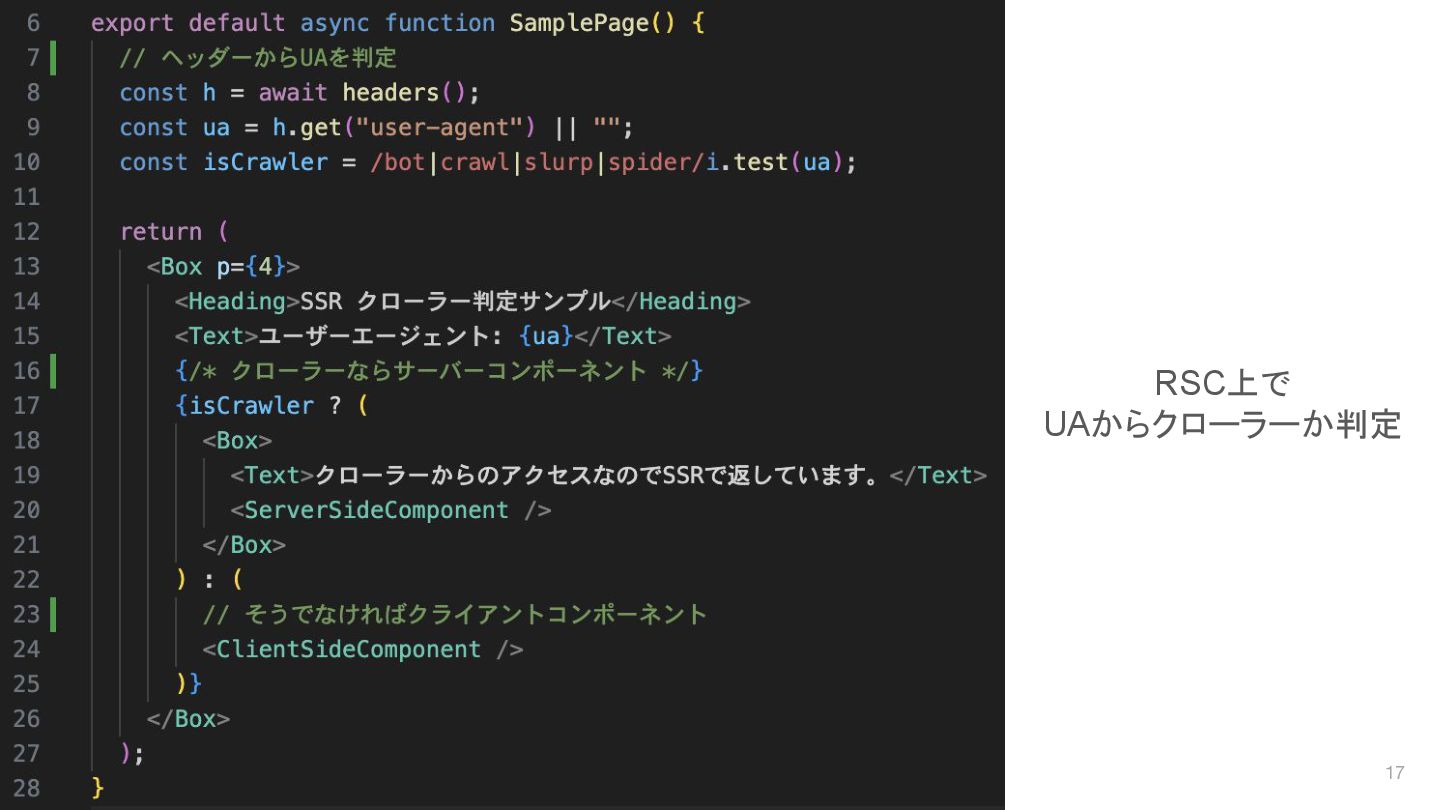 16 • CSRだとクローラーには内容が伝わらない ◦ SSRにすれば…? ◦ クローラー・ユーザーからの全部のリクエストを SSRにするのはパフォーマンスやコスト的に良くない ◦ →普通のユーザーなら