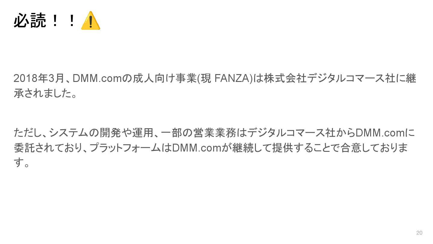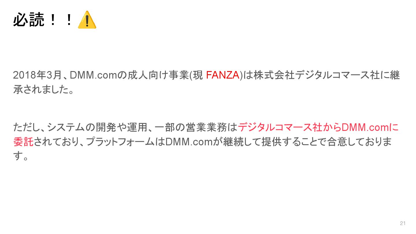 20 2018年3月、DMM.comの成人向け事業(現 FANZA)は株式会社デジタルコマース社に継 承されました。 ただし、システムの開発や運用、一部の営業業務はデジタルコマース社からDMM.comに 委託されており、プラットフォームはDMM.comが継続して提供することで合意しておりま す。 必読!!⚠