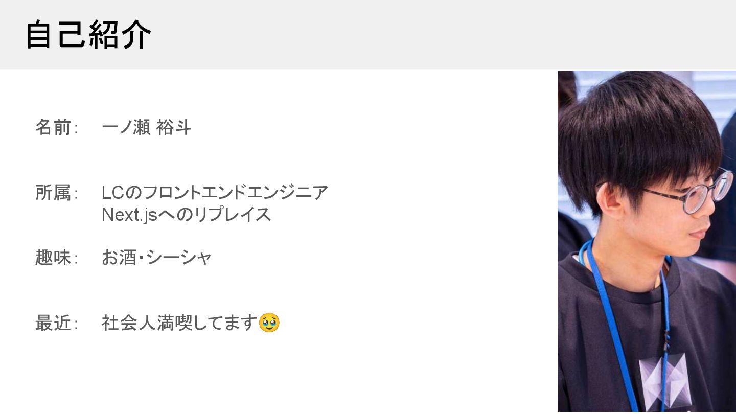 自己紹介 3 名前: 一ノ瀬 裕斗 所属: LCのフロントエンドエンジニア Next.jsへのリプレイス 趣味: お酒・シーシャ