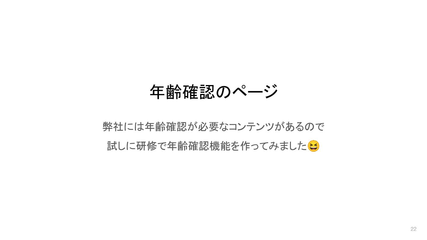 22 弊社には年齢確認が必要なコンテンツがあるので 試しに研修で年齢確認機能を作ってみました😆 年齢確認のページ