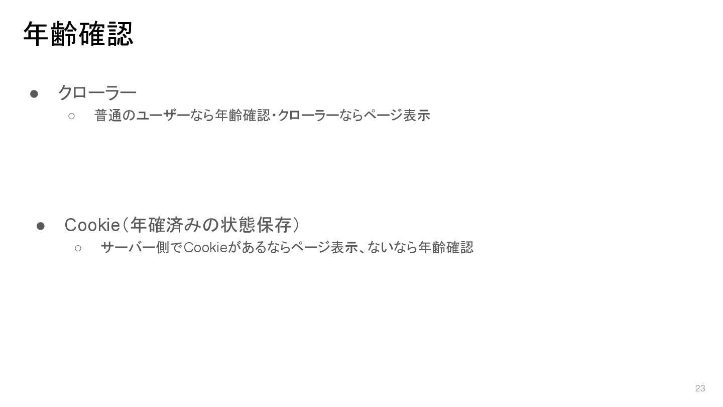 23 • クローラー ◦ 普通のユーザーなら年齢確認・クローラーならページ表示 年齢確認 • Cookie(年確済みの状態保存) ◦ サーバー側でCookieがあるならページ表示、ないなら年齢確認