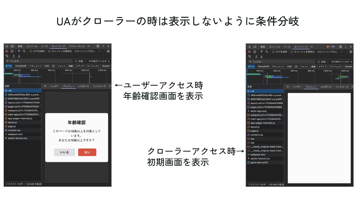 UAがクローラーの時は表示しないように条件分岐 ←ユーザーアクセス時 年齢確認画面を表示 クローラーアクセス時→ 初期画面を表示