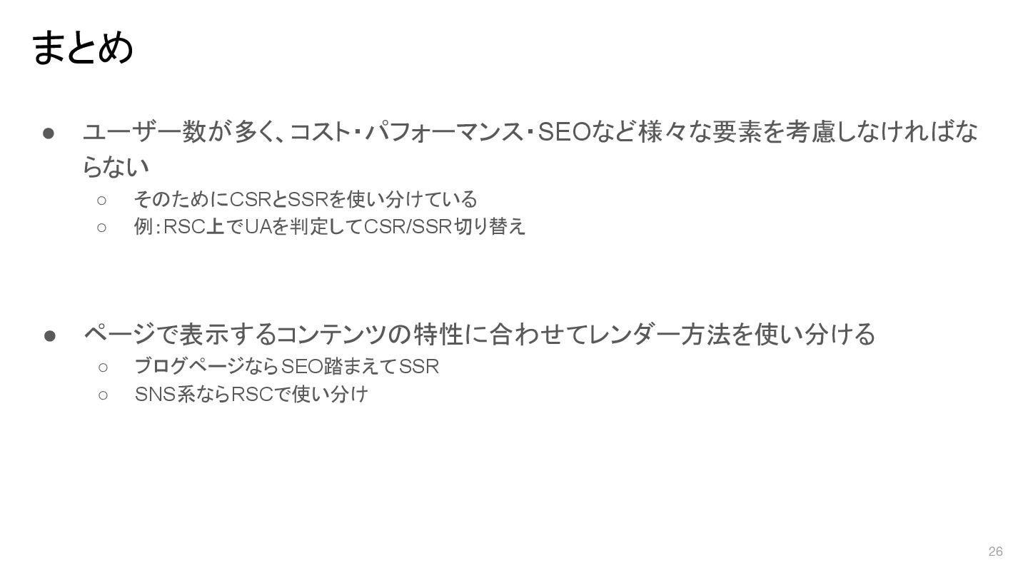 • ユーザー数が多く、コスト・パフォーマンス・SEOなど様々な要素を考慮しなければな らない ◦ そのためにCSRとSSRを使い分けている ◦ 例:RSC上でUAを判定してCSR/SSR切り替え 26 まとめ •