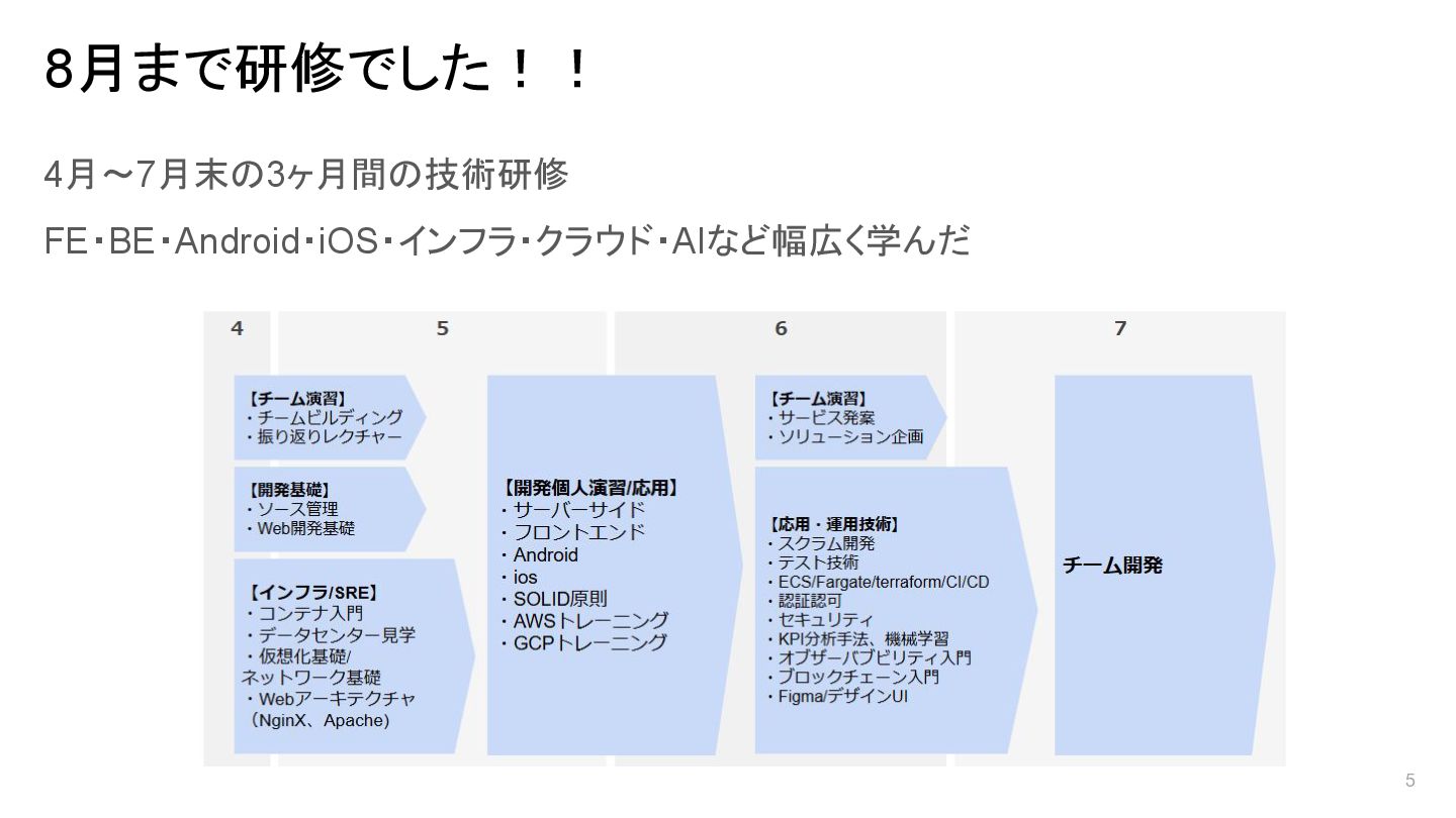 5 4月〜7月末の3ヶ月間の技術研修 FE・BE・Android・iOS・インフラ・クラウド・AIなど幅広く学んだ 8月まで研修でした!!