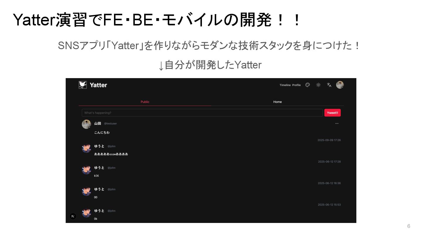 6 Yatter演習でFE・BE・モバイルの開発!! SNSアプリ「Yatter」を作りながらモダンな技術スタックを身につけた! ↓自分が開発したYatter