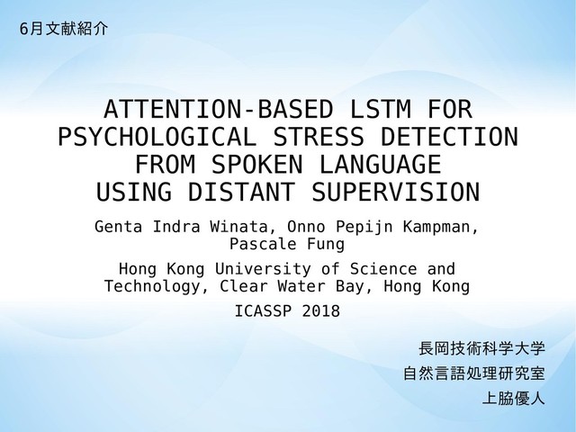 DISTANT SUPERVISION 長岡技術科学大学 自然言語処理研究室 上脇優人 Genta Indra Winata, Onno Pepijn Kampman, Pascale Fung Hong Kong University of Science and Technology, Clear Water Bay, Hong Kong ICASSP 2018 6月文献紹介