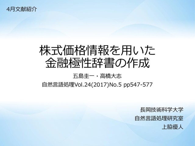 株式価格情報を用いた 金融極性辞書の作成 長岡技術科学大学 自然言語処理研究室 上脇優人 五島圭一・高橋大志 自然言語処理Vol.24(2017)No.5 pp547-577 4月文献紹介