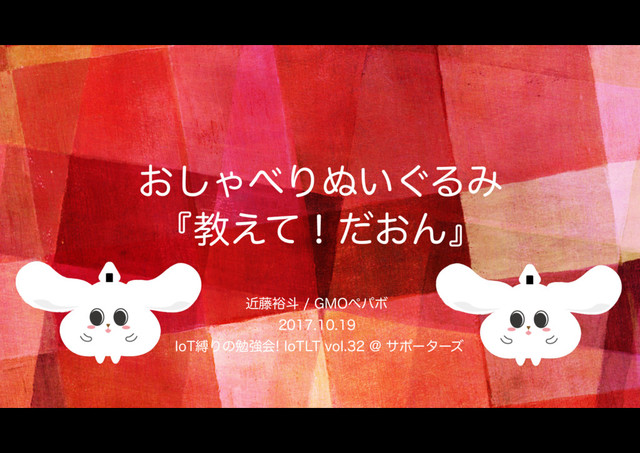 「IoT縛りの勉強会! IoTLT vol.32 @ サポーターズ」の登壇資料となります。会社の同僚とスピーカー型音声アシスタントぬいぐるみを作りました。簡単に説明すると Amazon Alexa を Raspberry Pi 上で動作させることで "おしゃべり" を実現しています。