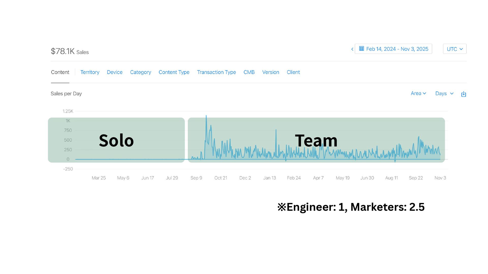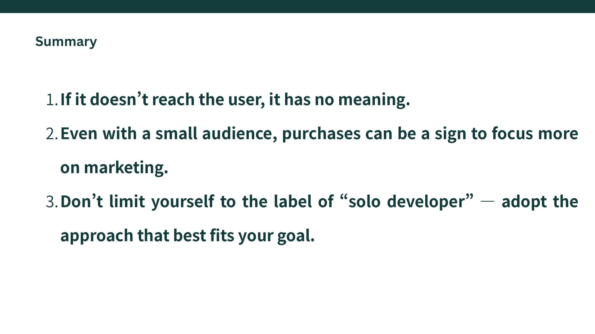 2.Even with a small audience, purchases can be a sign to focus more on marketing. 3.Don’t limit yourself to the label of “solo developer” — adopt the approach that best fits your goal. Summary