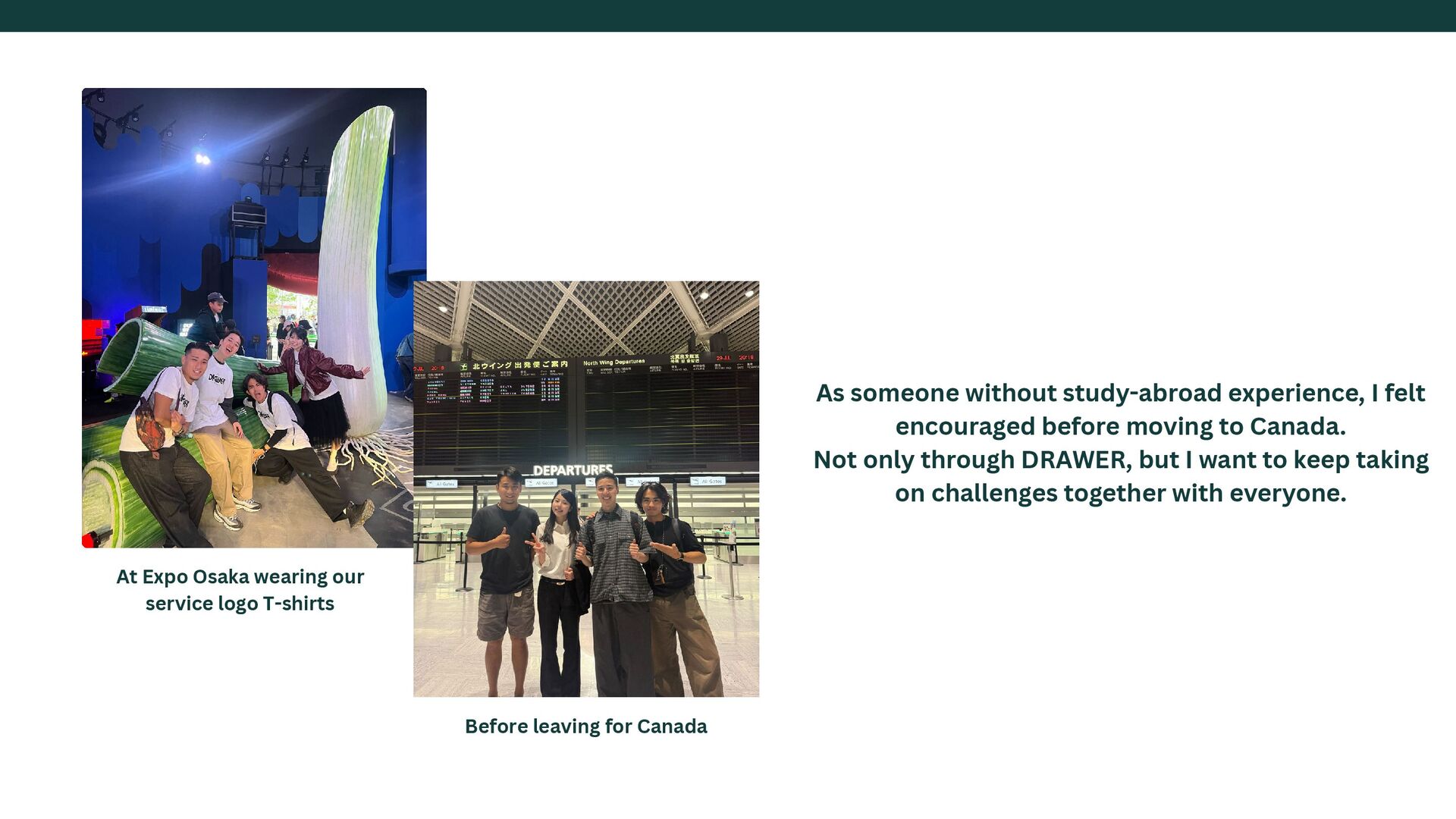for Canada As someone without study-abroad experience, I felt encouraged before moving to Canada. Not only through DRAWER, but I want to keep taking on challenges together with everyone.