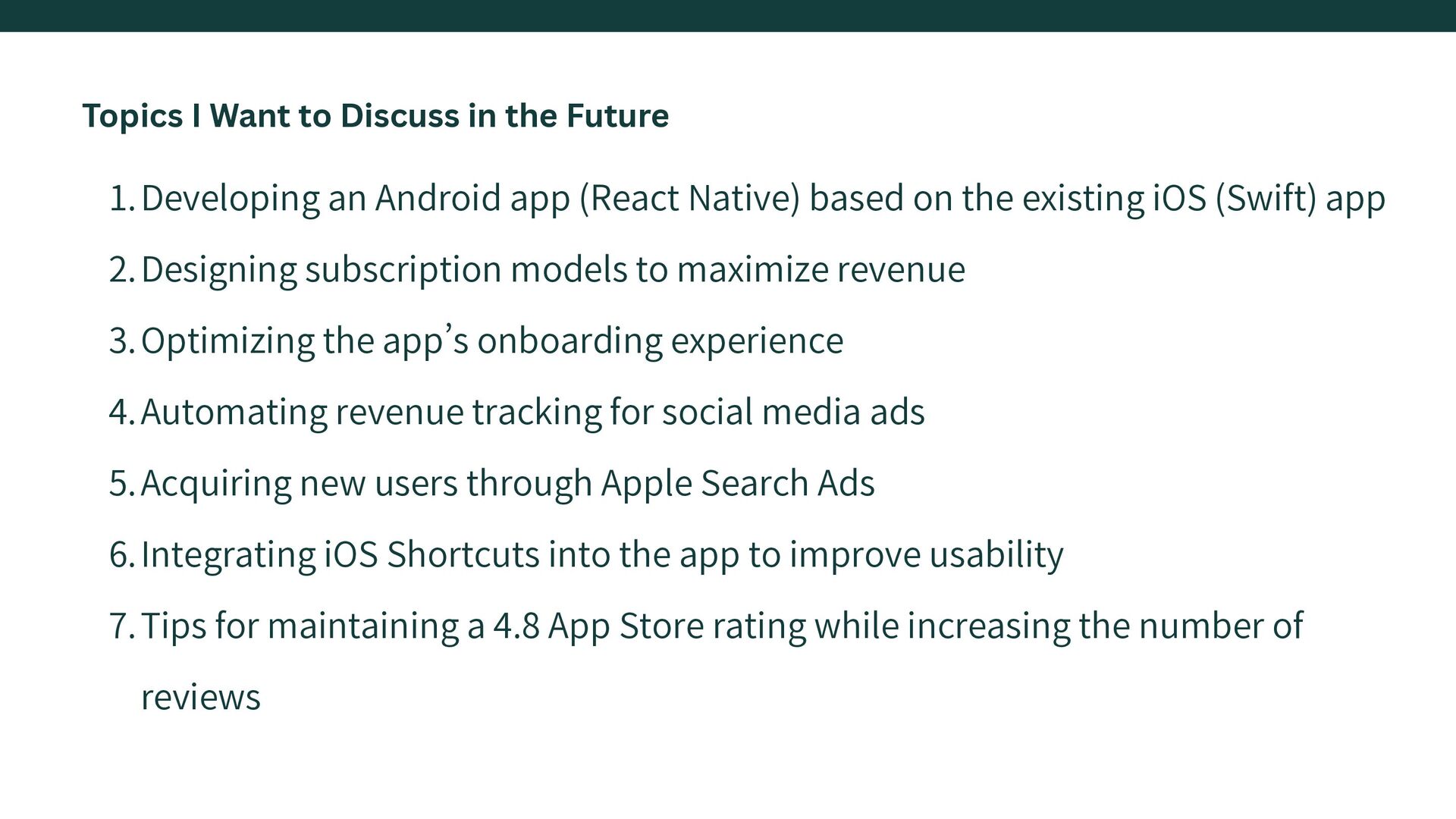 Android app (React Native) based on the existing iOS (Swift) app 2.Designing subscription models to maximize revenue 3.Optimizing the app’s onboarding experience 4.Automating revenue tracking for social media ads 5.Acquiring new users through Apple Search Ads 6.Integrating iOS Shortcuts into the app to improve usability 7.Tips for maintaining a 4.8 App Store rating while increasing the number of reviews