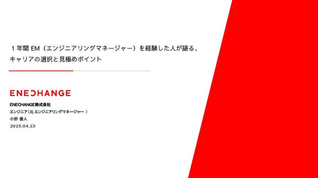 / not for distribution 小野 優人 の自己紹介 • 1995年生まれ(30歳) • ENECHANGE株式会社 ◦ EM(2024/03 〜 2025/03) ◦ フロントエンドエンジニア(バックエンド、インフラも) • スキル ◦ 得意な技術: TypeScript, React, Next.js ◦ その他: Ruby on Rails, Go, Svelte, Rust, terraform 等 • 趣味 ◦ ピアノ、ルービックキューブ、将棋など ◦ 仕事も趣味の延長(開発まじで楽しい) ◦ やりたいことが多すぎて時間が足りないのが悩み