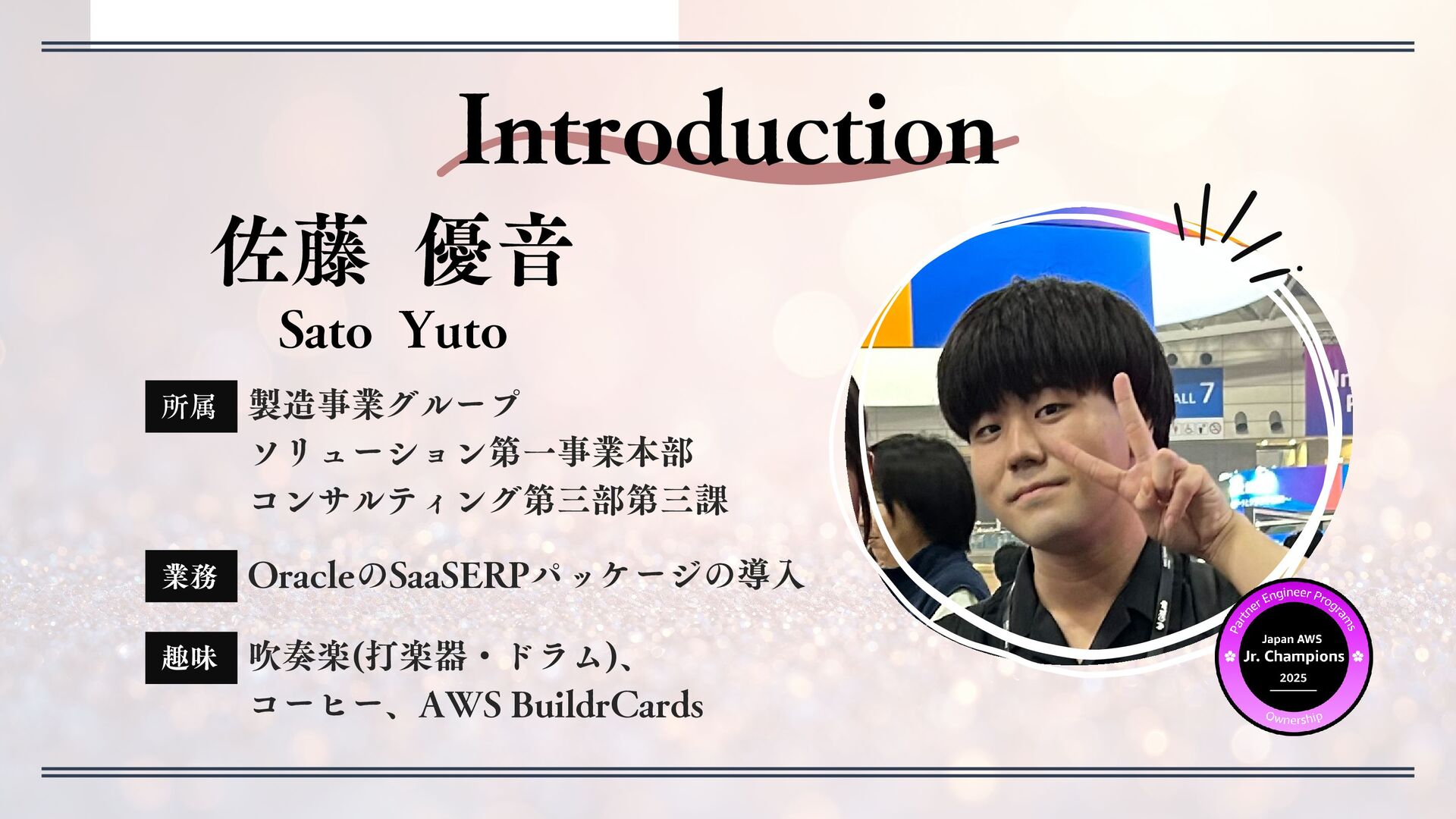 製造事業グループ ソリューション第一事業本部 コンサルティング第三部第三課 所属 吹奏楽(打楽器・ドラム)、 コーヒー、AWS BuildrCards 趣味 OracleのSaaSERPパッケージの導入 業務