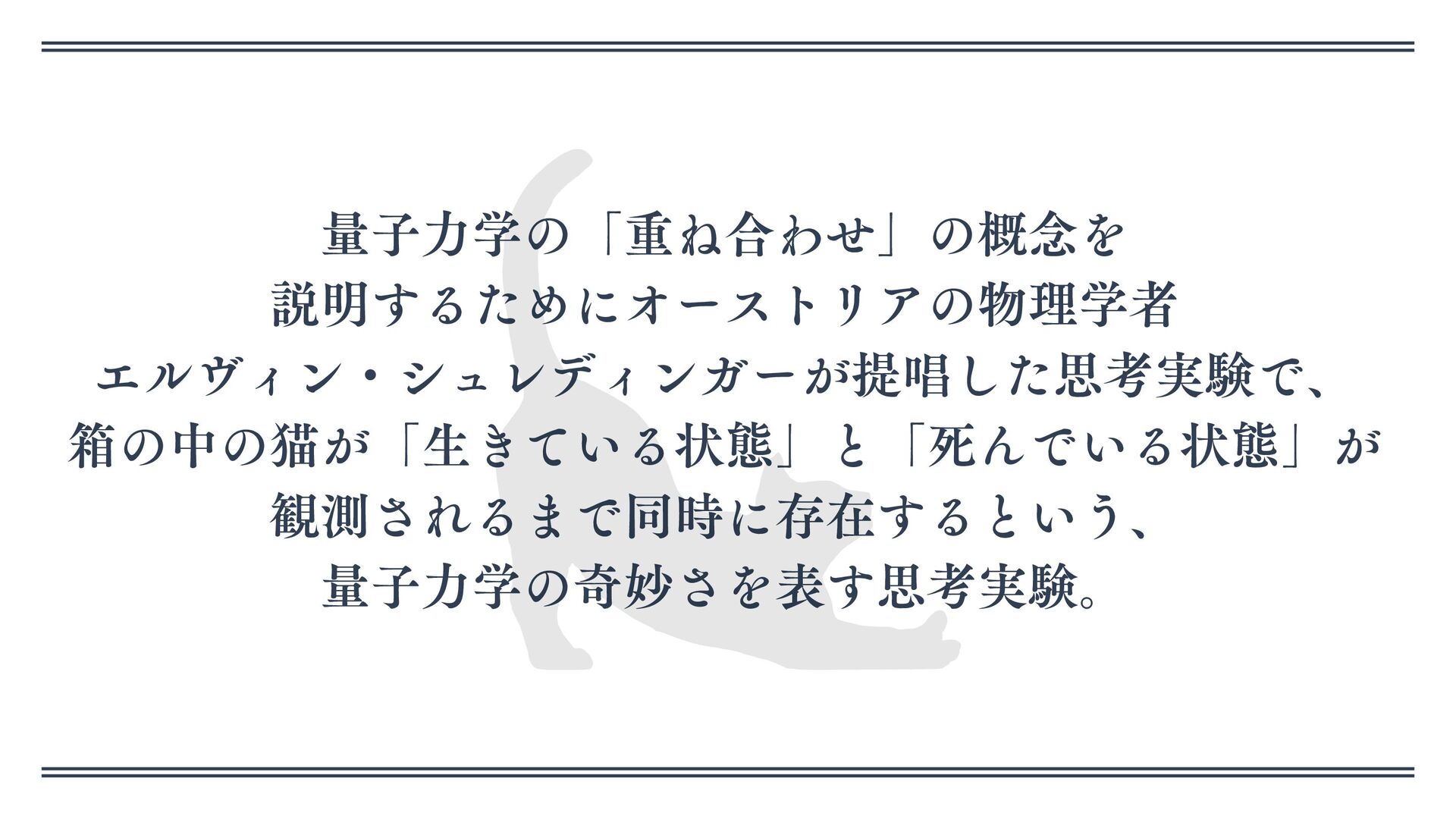 量子力学の「重ね合わせ」の概念を 説明するためにオーストリアの物理学者 エルヴィン・シュレディンガーが提唱した思考実験で、 箱の中の猫が「生きている状態」と「死んでいる状態」が 観測されるまで同時に存在するという、 量子力学の奇妙さを表す思考実験。