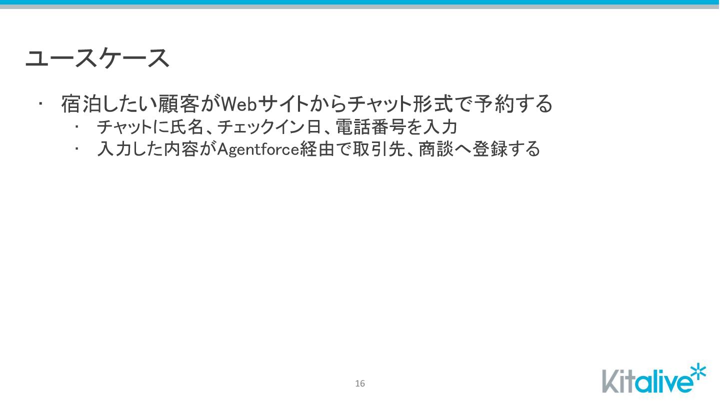 ユースケース • 宿泊したい顧客がWebサイトからチャット形式で予約する • チャットに氏名、チェックイン日、電話番号を入力 • 入力した内容がAgentforce経由で取引先、商談へ登録する 16