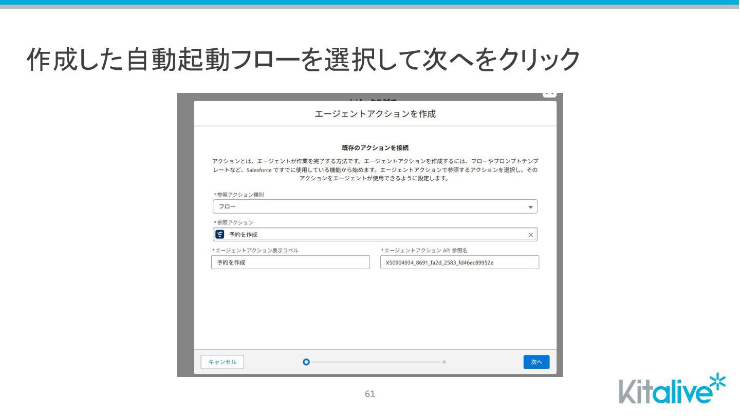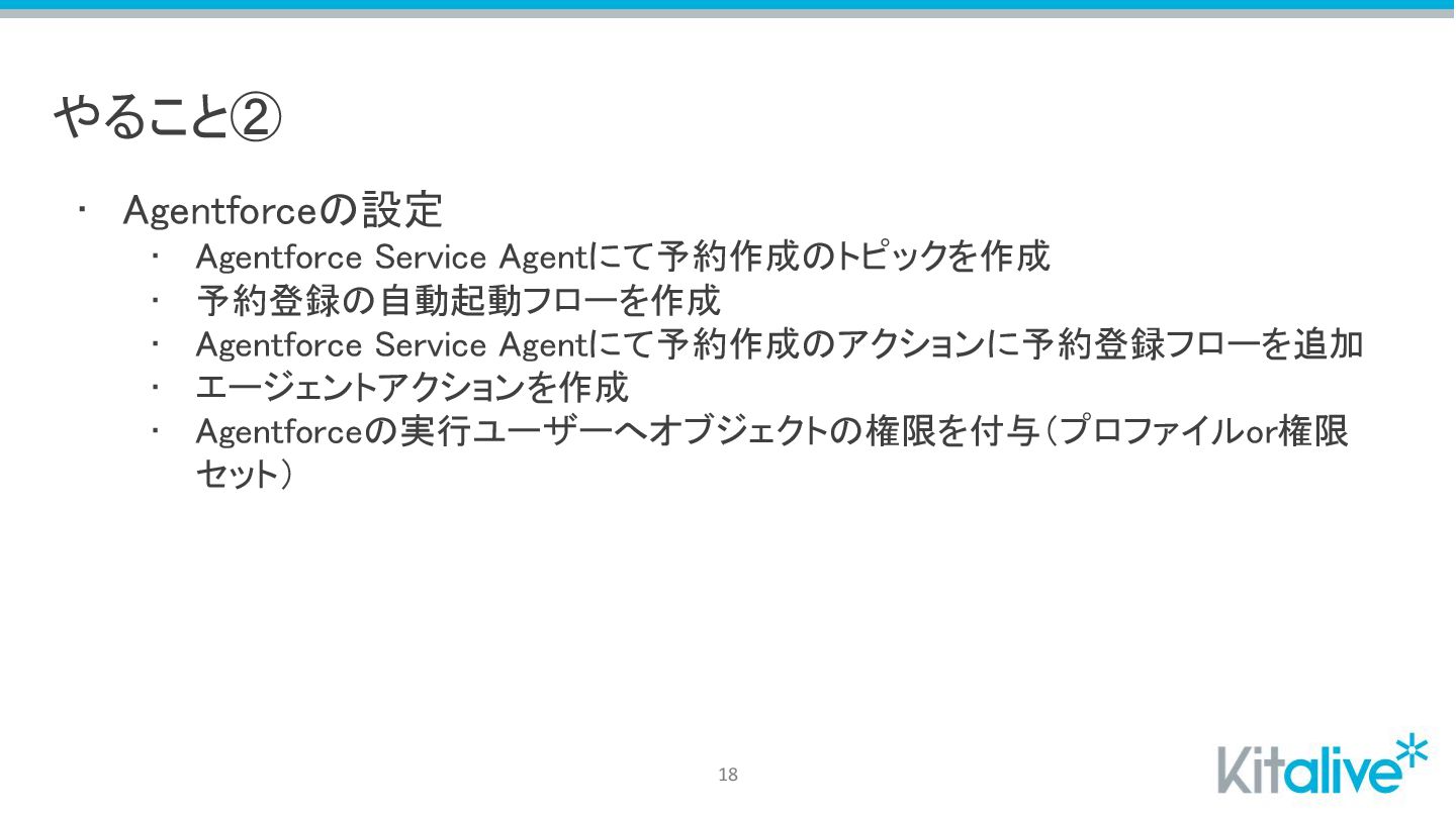 やること② • Agentforceの設定 • Agentforce Service Agentにて予約作成のトピックを作成 • 予約登録の自動起動フローを作成 •