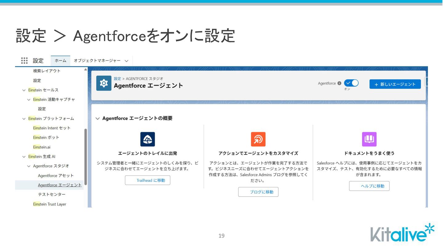 設定 > Agentforceをオンに設定 19