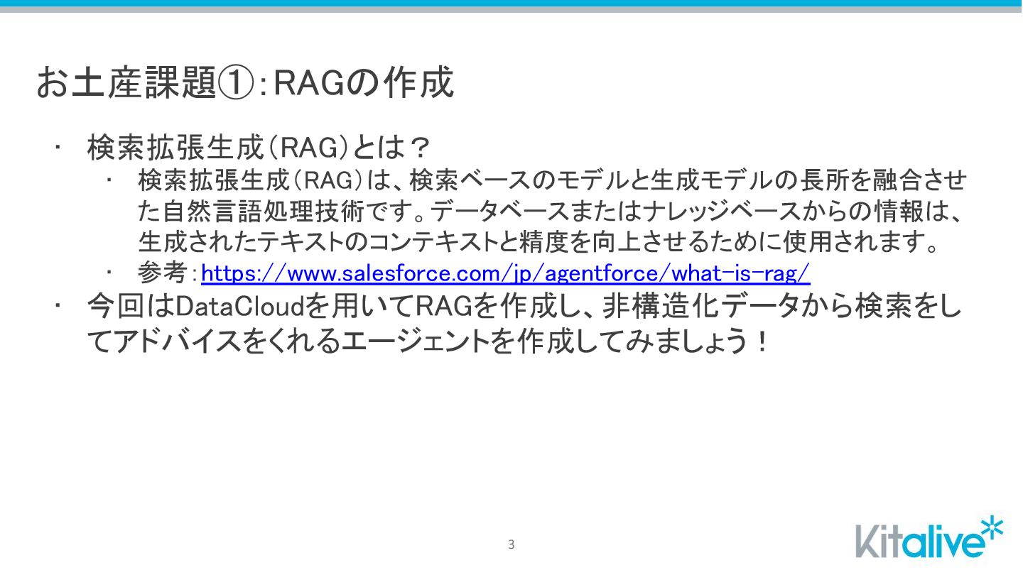 お土産課題①:RAGの作成 • 検索拡張生成(RAG)とは? • 検索拡張生成(RAG)は、検索ベースのモデルと生成モデルの長所を融合させ た自然言語処理技術です。データベースまたはナレッジベースからの情報は、 生成されたテキストのコンテキストと精度を向上させるために使用されます。 • 参考:https://www.salesforce.com/jp/agentforce/what-is-rag/ •