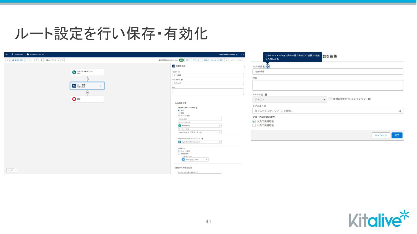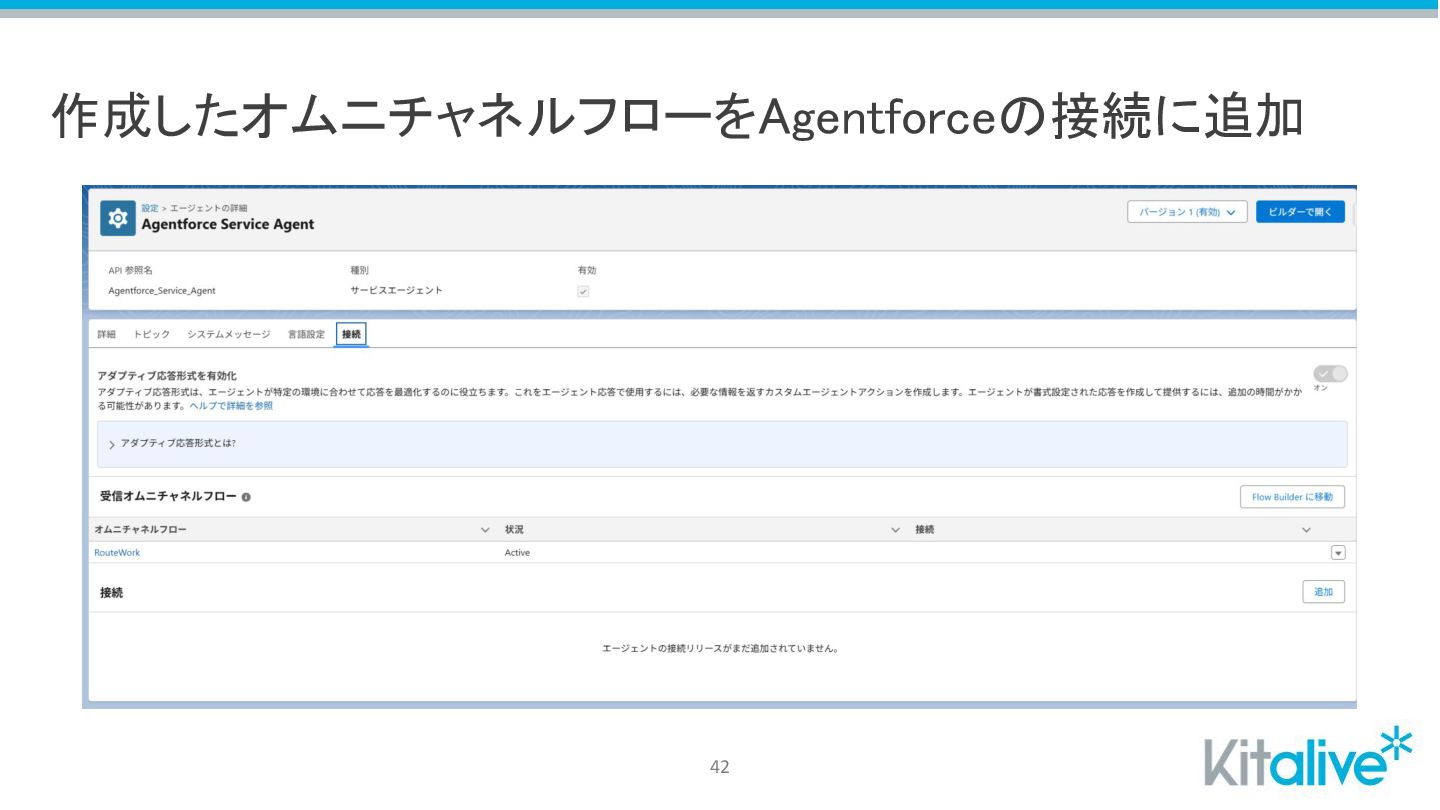 作成したオムニチャネルフローをAgentforceの接続に追加 42