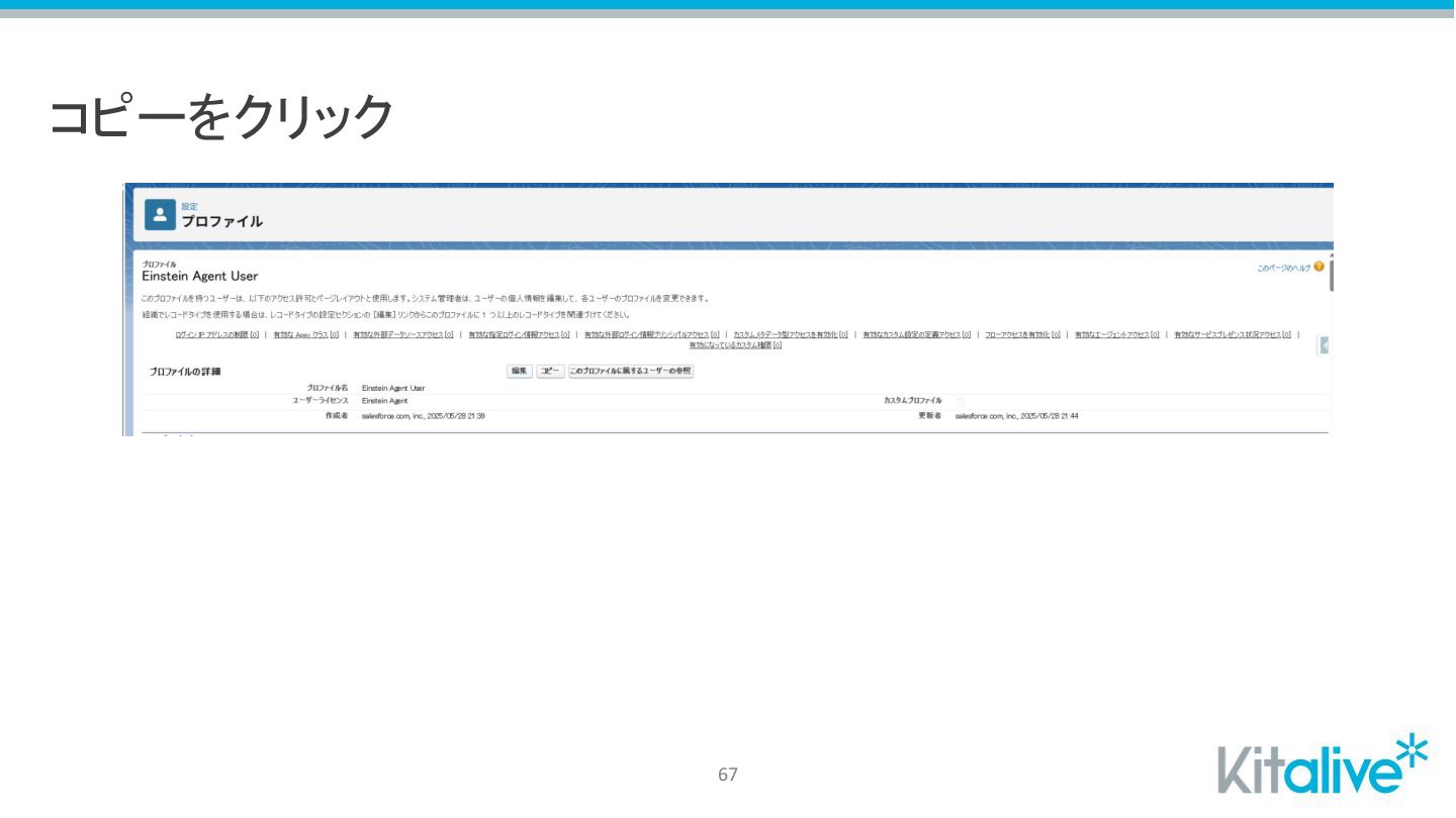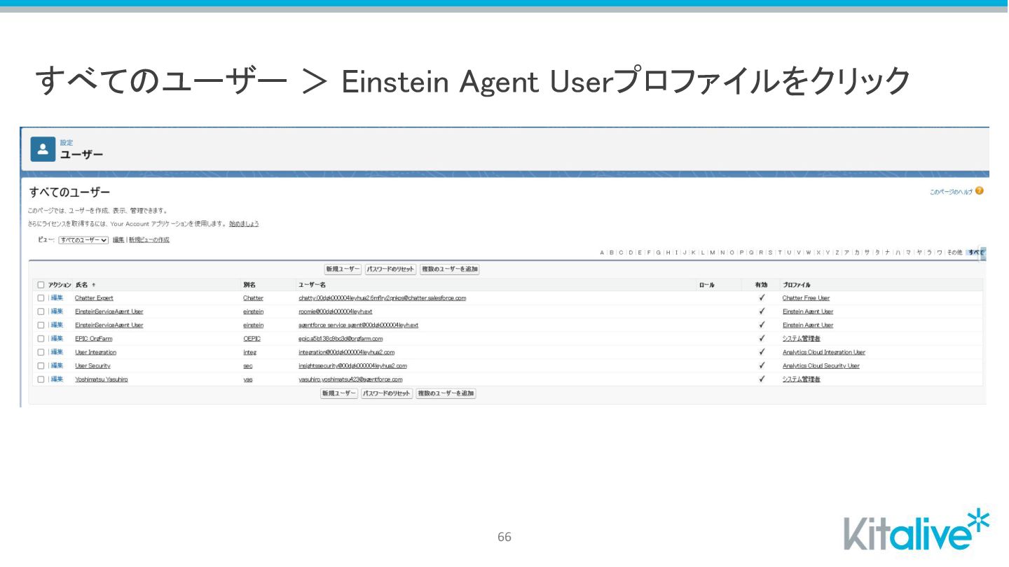 すべてのユーザー > Einstein Agent Userプロファイルをクリック 66