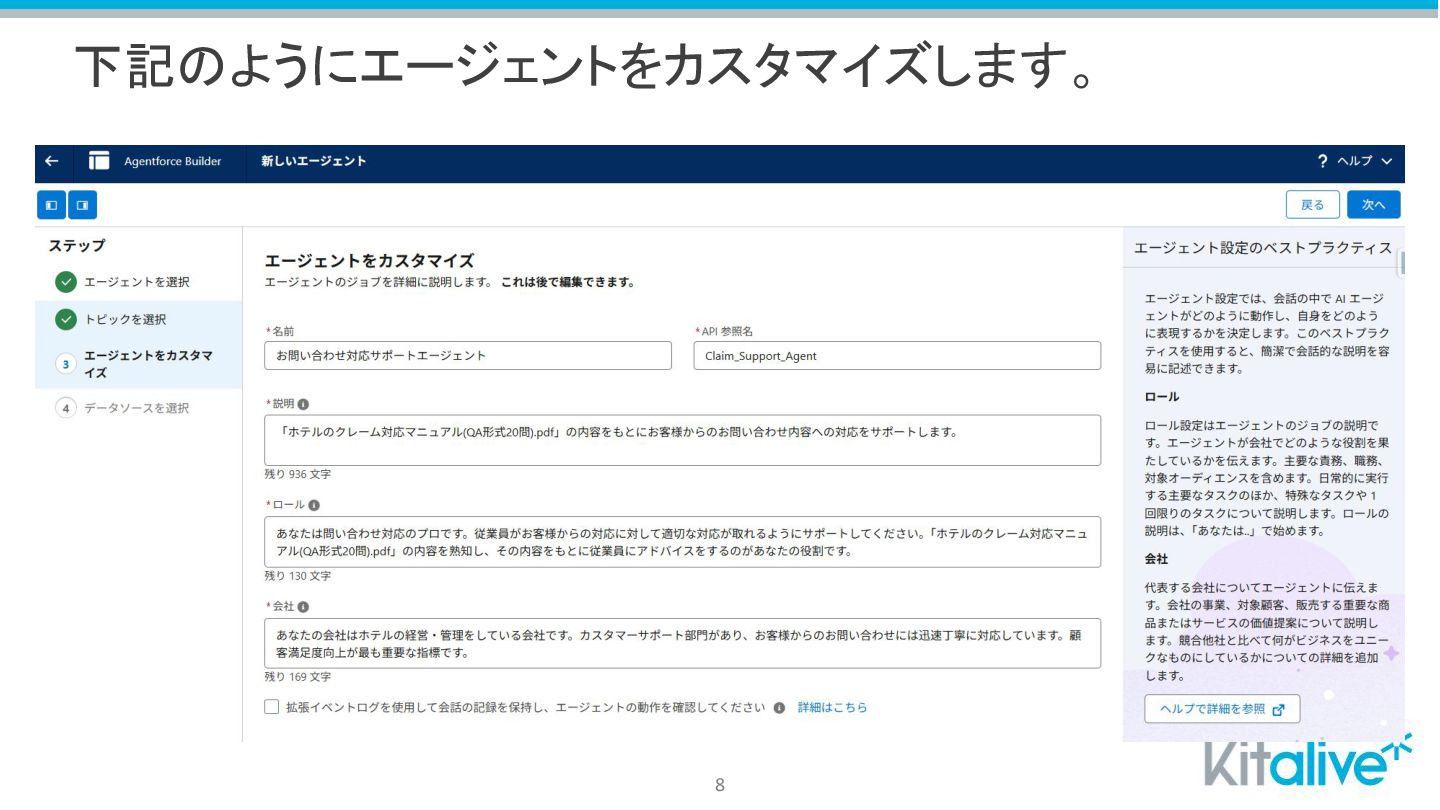 下記のようにエージェントをカスタマイズします。 8
