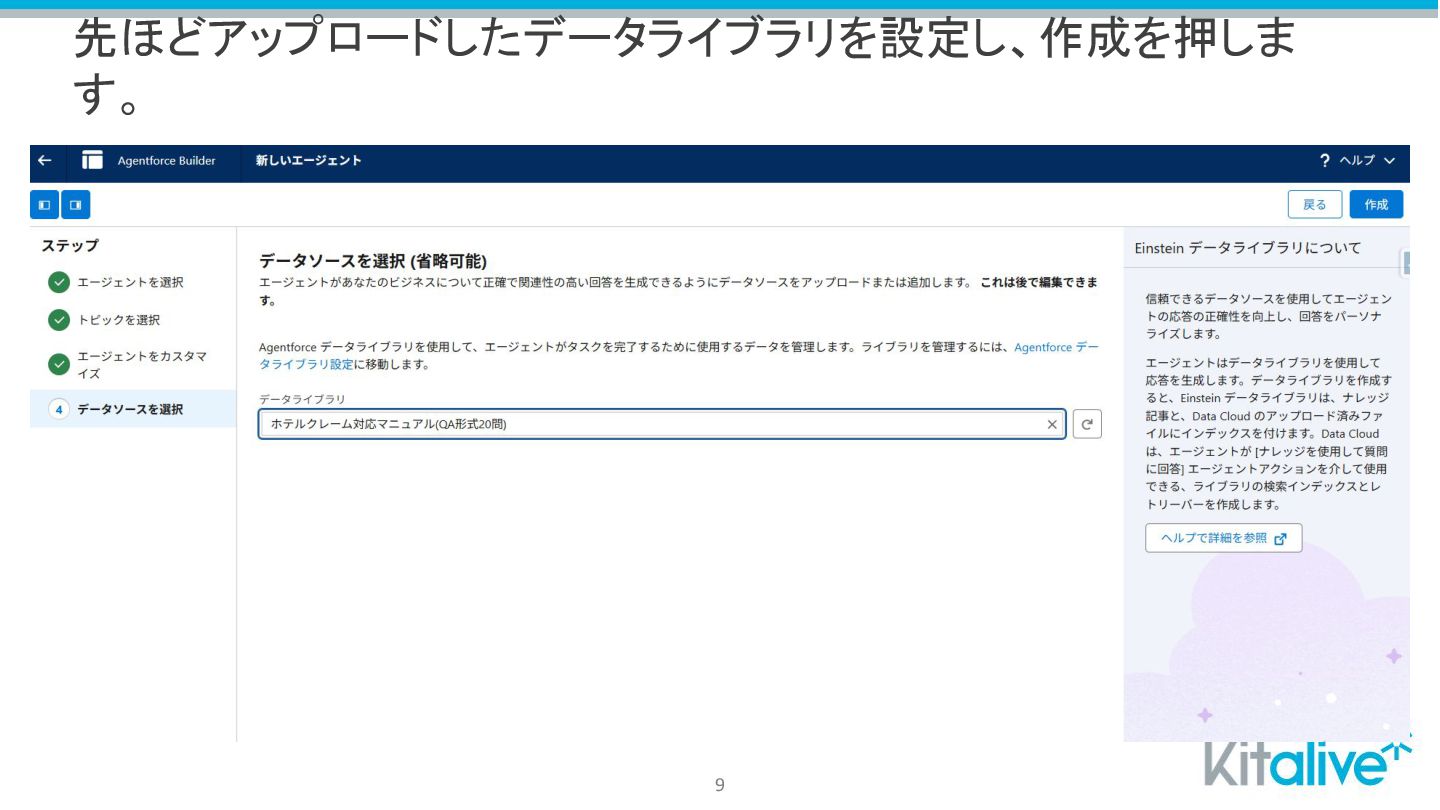 先ほどアップロードしたデータライブラリを設定し、作成を押しま す。 9
