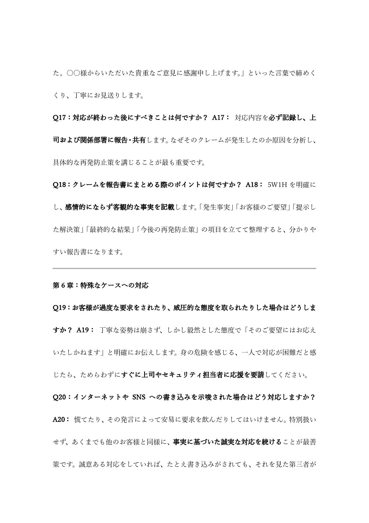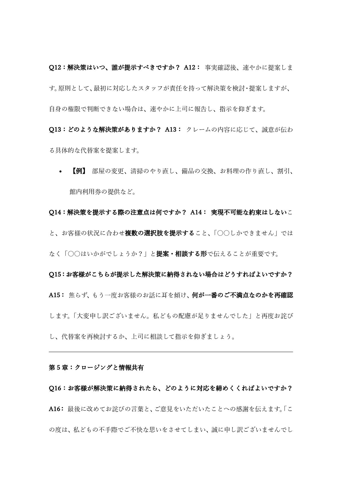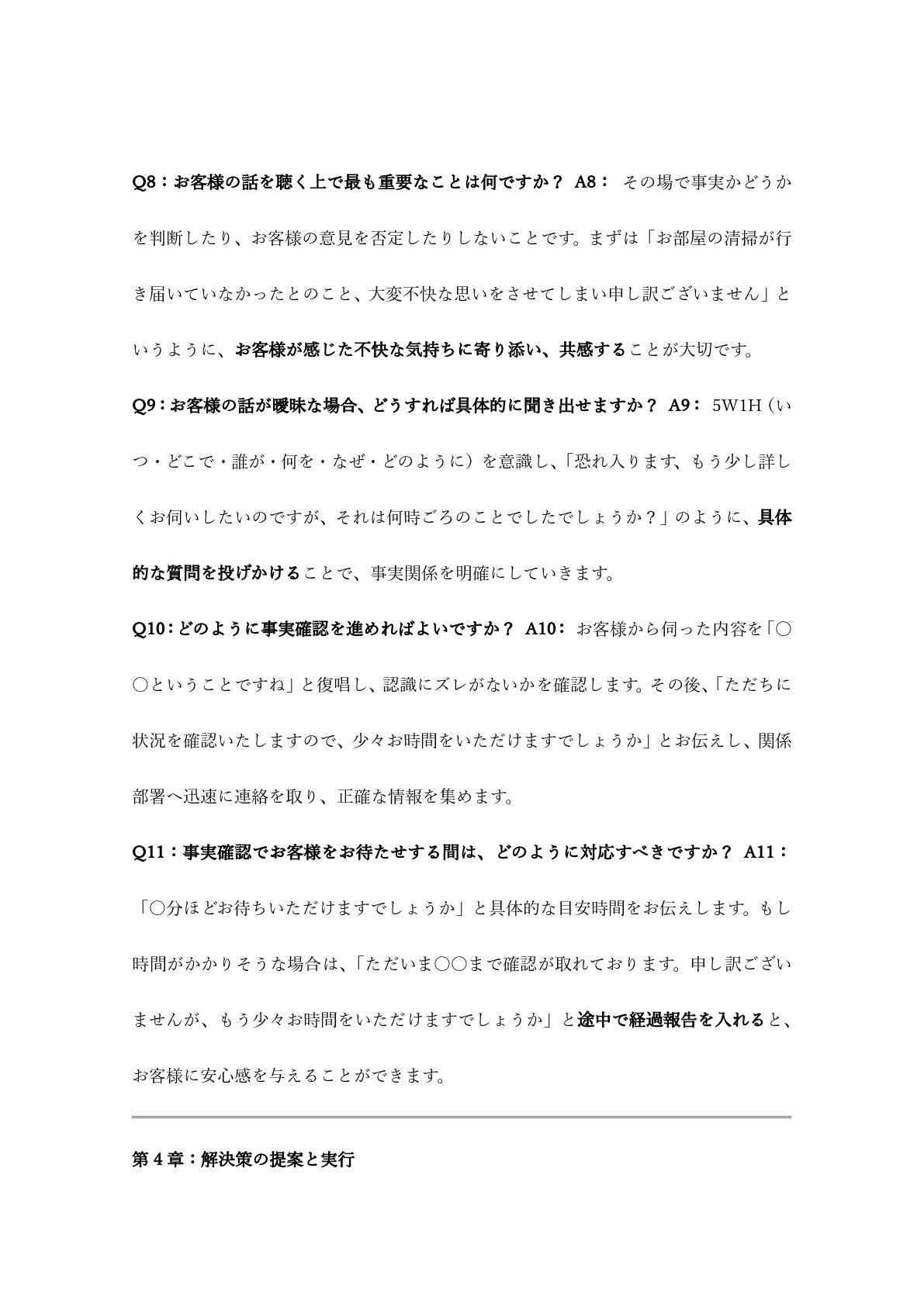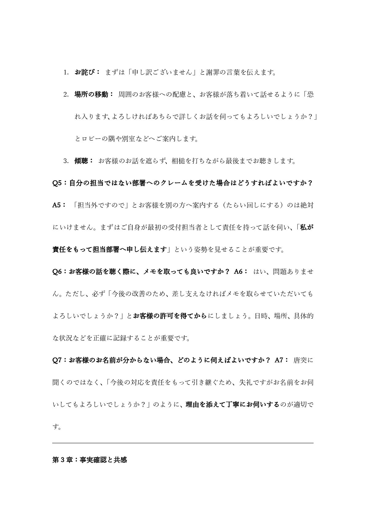 まずは傾聴と共感の姿勢で す。お客様が何に不満を感じ、何を伝えたいのかを真摯に受け止めます。 「ご不快な思い をさせてしまい申し訳ございません」というお詫びの気持ちを最初に伝え、お客様のお 話を最後まで真剣にお聴きすることが信頼回復の第一歩です。 Q2:クレーム対応における言葉遣いで気をつけるべき点は何ですか? A2: 丁寧語・ 尊敬語を正しく使うことはもちろん、 「恐れ入りますが」 「あいにくですが」といったク ッション言葉を効果的に使いましょう。また、 「できません」 「分かりません」といった 否定的な表現は避け、 「いたしかねます」 「確認いたします」など、前向きで誠実な印象 を与える言葉を選びます。 Q3:クレームはホテルにとって悪いことばかりですか? A3: いいえ、クレームはサ ービスの質を向上させるための貴重なご意見です。お客様がわざわざ伝えてくださった 問題点を真摯に受け止め、改善につなげることで、より良いホテルへと成長する機会と 捉えましょう。 第 2 章:初期対応 Q4:お客様からクレームを受けたら、最初に何をすべきですか? A4: 以下の 3 つの ステップで対応します。