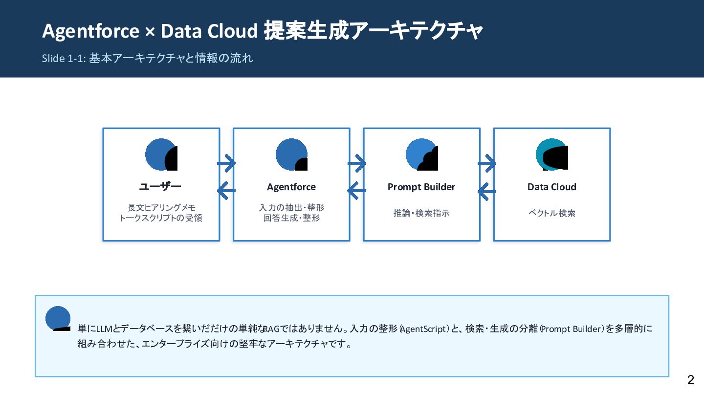 トークスクリプトの受領 Agentforce 入力の抽出・整形 回答生成・整形 Prompt Builder 推論・検索指示 Data Cloud ベクトル検索 単にLLMとデータベースを繋いだだけの単純な RAGではありません。入力の整形( AgentScript)と、検索・生成の分離( Prompt Builder)を多層的に 組み合わせた、エンタープライズ向けの堅牢なアーキテクチャです。 2