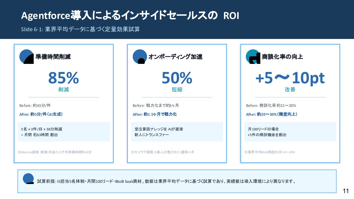 Agentforce導入によるインサイドセールスの ROI Slide 6-1: 業界平均データに基づく定量効果試算 準備時間削減 85% 削減 Before: 約43分/件