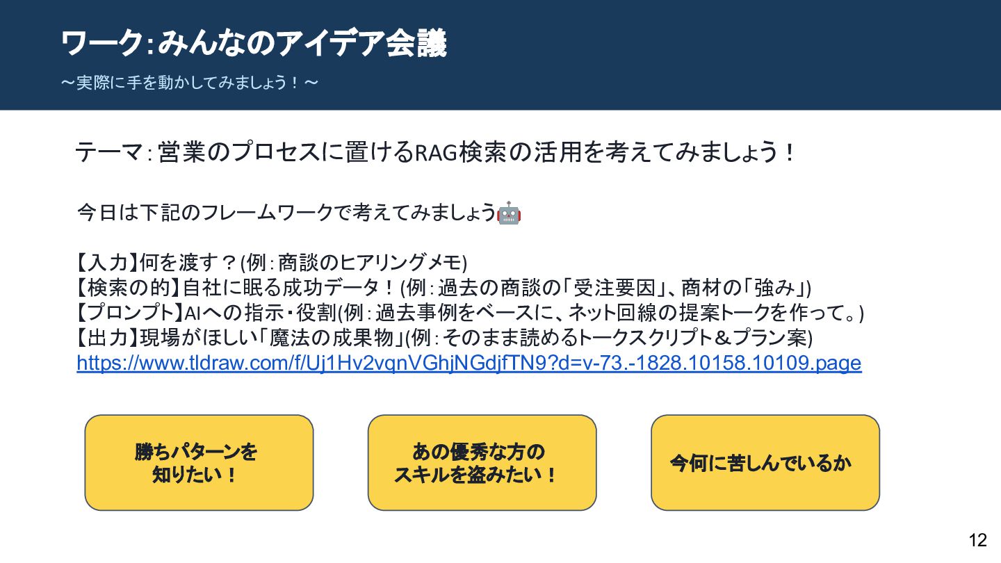 ワーク:みんなのアイデア会議 ~実際に手を動かしてみましょう!~ テーマ:営業のプロセスに置けるRAG検索の活用を考えてみましょう! あの優秀な方の スキルを盗みたい! 今何に苦しんでいるか 勝ちパターンを 知りたい! 今日は下記のフレームワークで考えてみましょう🤖 【入力】何を渡す?(例:商談のヒアリングメモ)