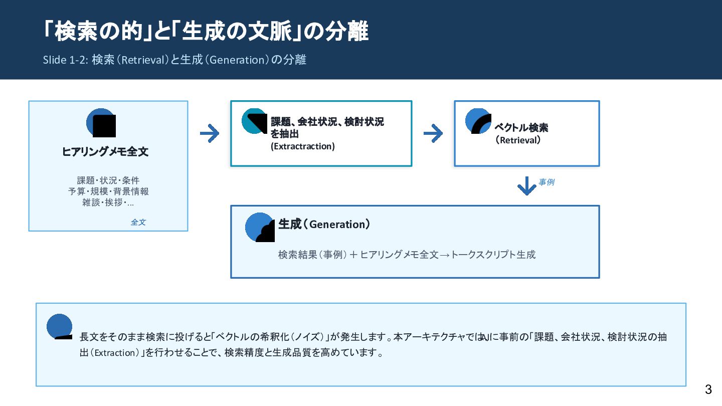 「検索の的」と「生成の文脈」の分離 Slide 1-2: 検索(Retrieval)と生成(Generation)の分離 ヒアリングメモ全文 課題・状況・条件 予算・規模・背景情報 雑談・挨拶・... 課題、会社状況、検討状況 を抽出