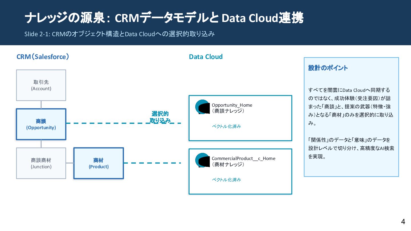 ナレッジの源泉: CRMデータモデルと Data Cloud連携 Slide 2-1: CRMのオブジェクト構造とData Cloudへの選択的取り込み CRM(Salesforce) 取引先