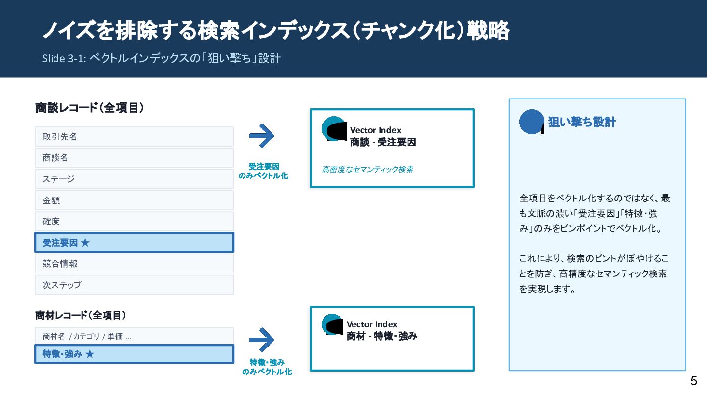 ノイズを排除する検索インデックス(チャンク化)戦略 Slide 3-1: ベクトルインデックスの「狙い撃ち」設計 商談レコード(全項目) 取引先名 商談名 ステージ 金額 確度
