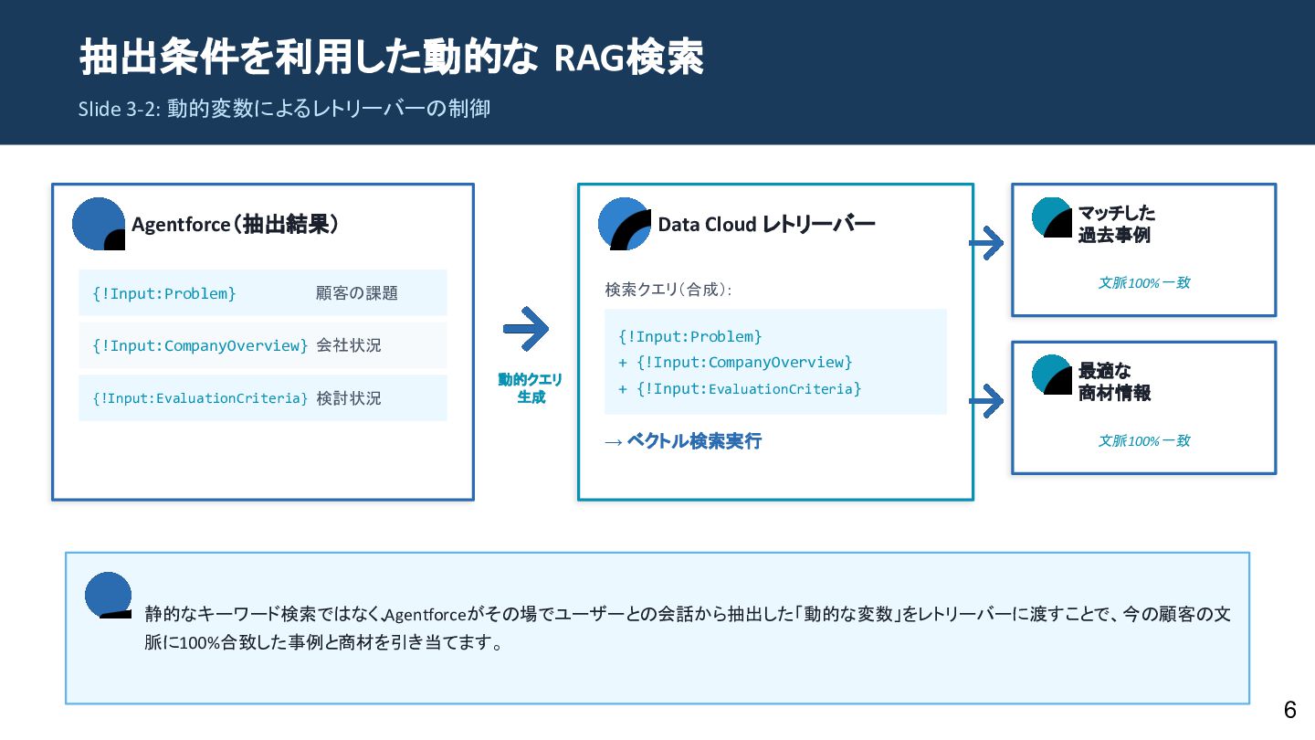 抽出条件を利用した動的な RAG検索 Slide 3-2: 動的変数によるレトリーバーの制御 Agentforce(抽出結果) {!Input:Problem} 顧客の課題 {!Input:CompanyOverview} 会社状況